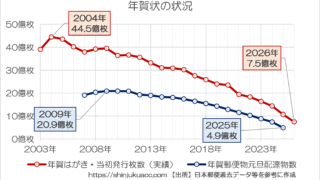 日本郵便が今年8月に発表したプレスリリースによると、来年用、つまり2026年用の年賀はがきの当初発行枚数が3.2億枚減り、7.5億枚となったのだそうです。このペースで減り続けたら、下手をすると3年以内に現在のようなお年玉くじ付き年賀はがきの発行がなくなってしまうかもしれません。ただ、その要因としては、単なる社会のネット化だけでなく、個人情報保護法による人々の意識の変化、という側面もあるのかもしれません。 (さらに…)