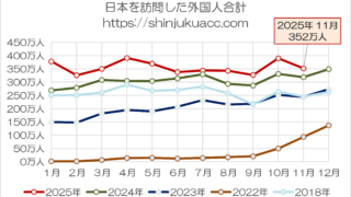 中国で始まったノージャパンの影響、現時点では少なくともほとんど確認できません。日本政府観光局(JNTO)が昨日公表した『訪日外客統計』によれば、2025年11月に日本に入国した外国人は351万8000人と、11月としては過去最大を記録。1月からの11ヵ月間累計ではなんとf3906万5627人と、年間を通じた訪日客も過去最大となったからです。 (さらに…)