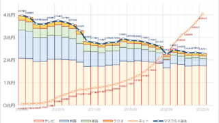 株式会社電通が今年も『日本の広告費』のデータを公表しました。これによると2025年の広告費は史上初めて8兆円の大台に乗せたのですが、なんと驚くことに、その半額がネット広告費だったのです。しかもネット広告費は昨年と比べ1.1倍に増え、2000年と比べるとじつに70倍近くに成長した格好です。一方、広告費全体が伸びているにも関わらず、マスコミ4媒体広告費は前年比で落ち込みました。 (さらに…)