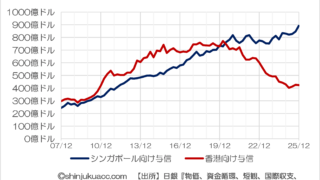 最新の金融統計からは、邦銀が香港向けの与信を減らした結果、いまやシンガポール向け与信と比べ、倍以上の差がついていることが明らかになりました。また、高市発言以降、日中関係がギクシャクしていると伝えられますが、少なくとも金融の世界においては、それとは無関係に、邦銀の脱香港・脱中国の流れが傾向として続いていることがグラフからは見て取れます。 (さらに…)