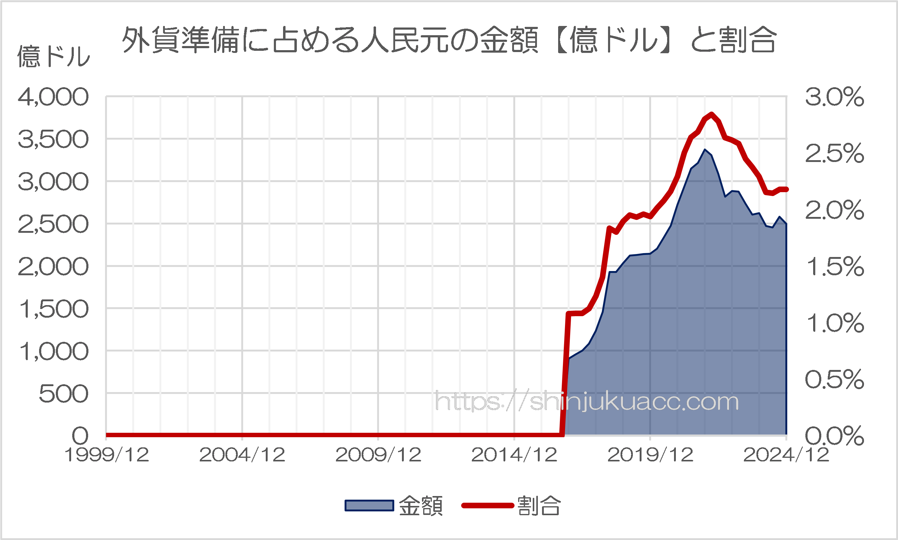 図表5 外貨準備に占める人民元の金額【億ドル】と割合