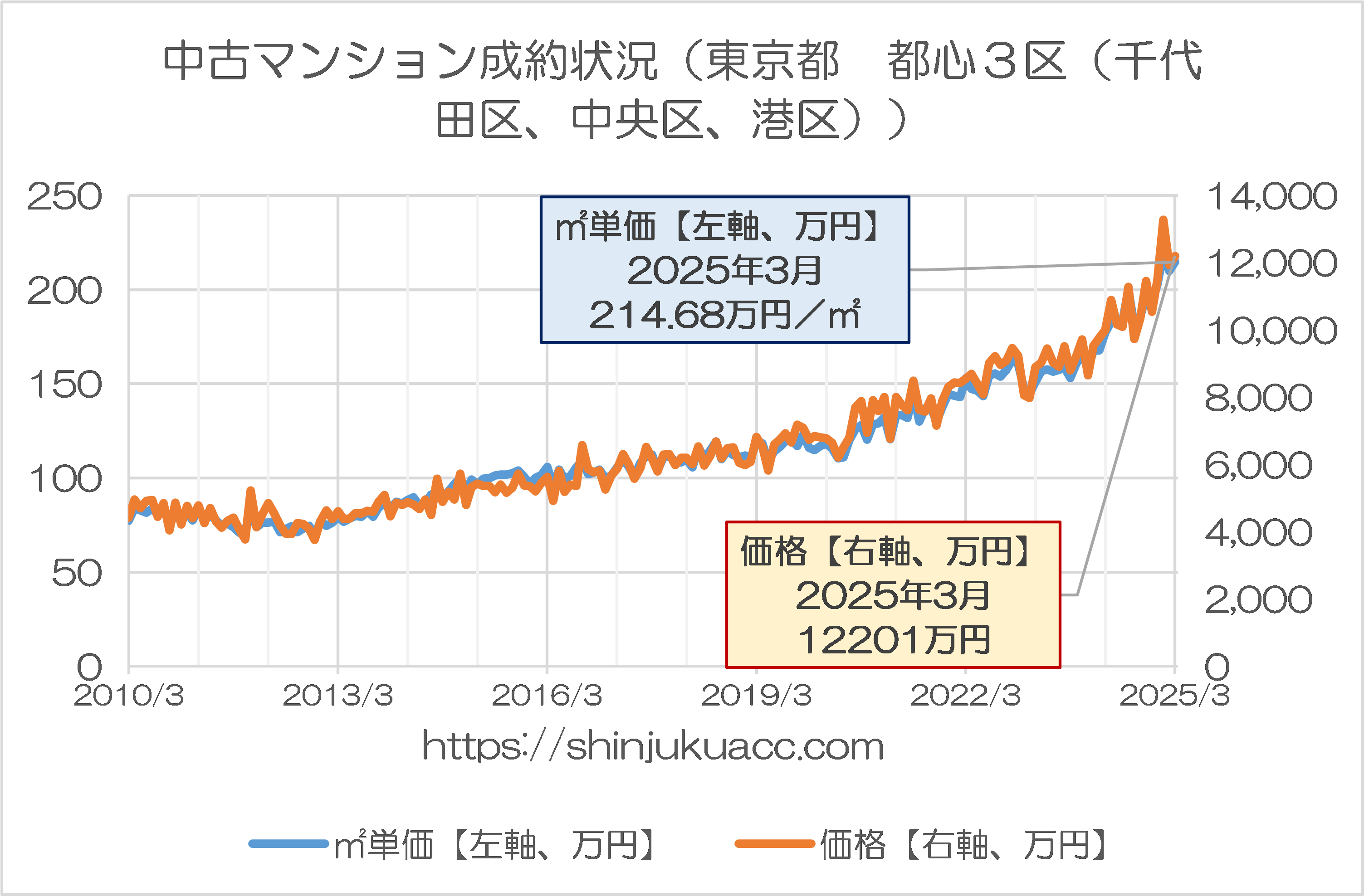 都心3区(千代田区、中央区、港区)の中古マンション成約状況を見ると、図表2-1のとおり、平米単価では214.68万円/㎡、成約価格では1億2201万円と、どちらも2025年1月に次ぎ過去2番目の水準で、2012年11月(単価69.03万円、価格3757万円)と比べると3倍以上です。