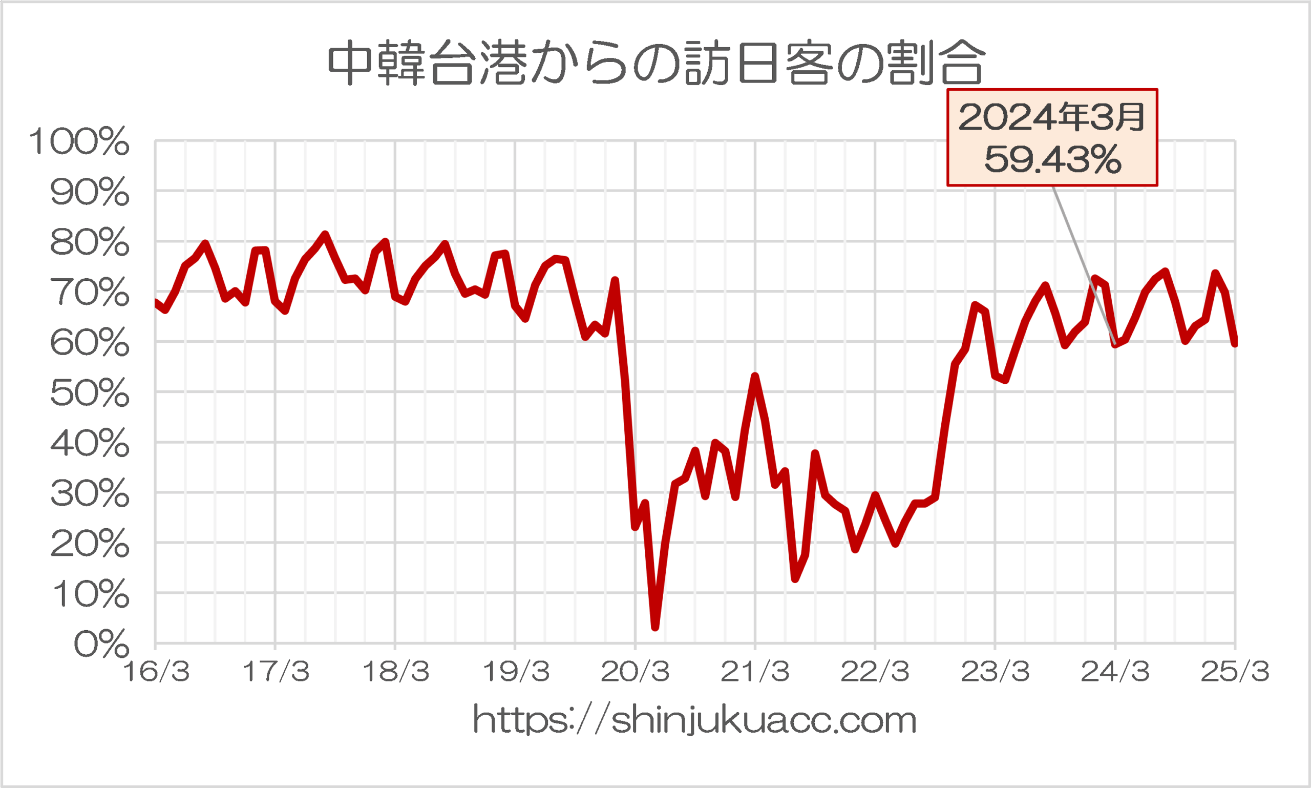 図表2は、JNTOデータに示された訪日外国人全体に占める中韓台港4ヵ国・地域からの入国者の割合を示したものです。