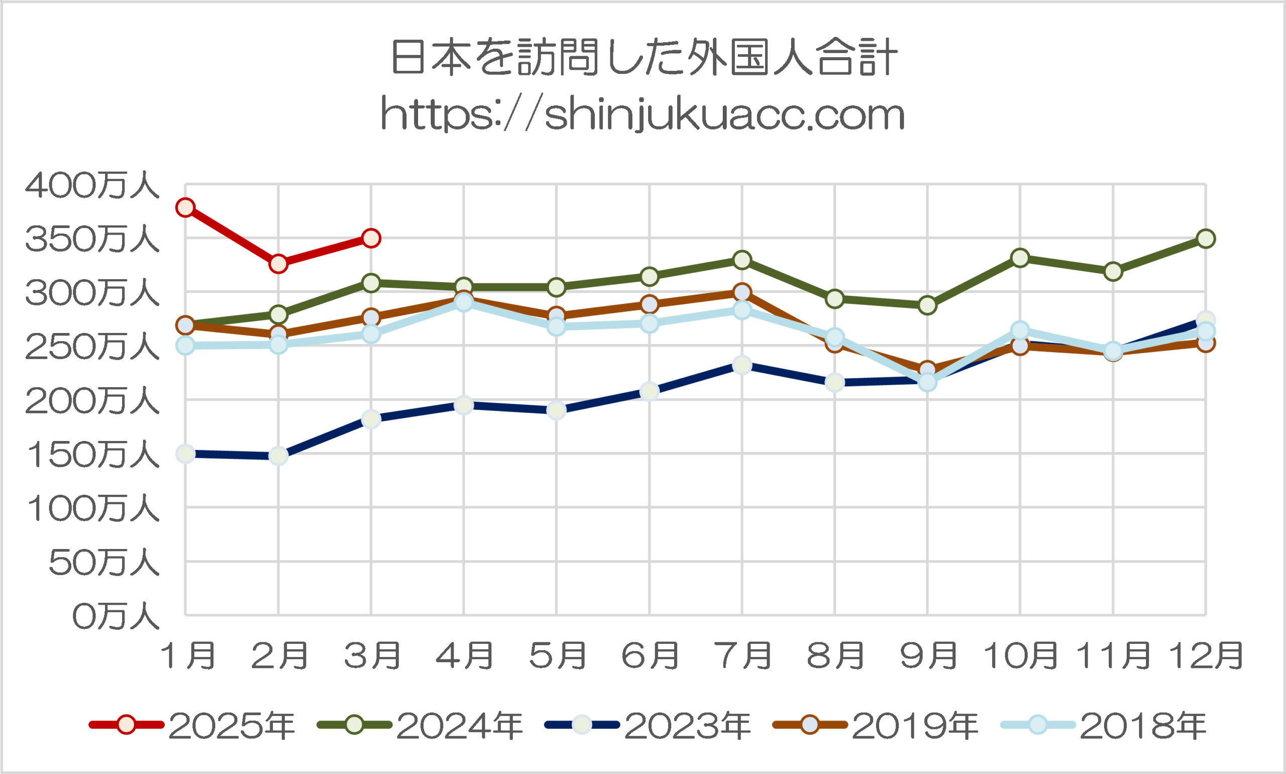 これで見ると、2025年3月の訪日外国人総数(※速報値)は349.8万人で、2024年3月の308.2万人から41.6万人増えました。増加率でいえば13.49%です。