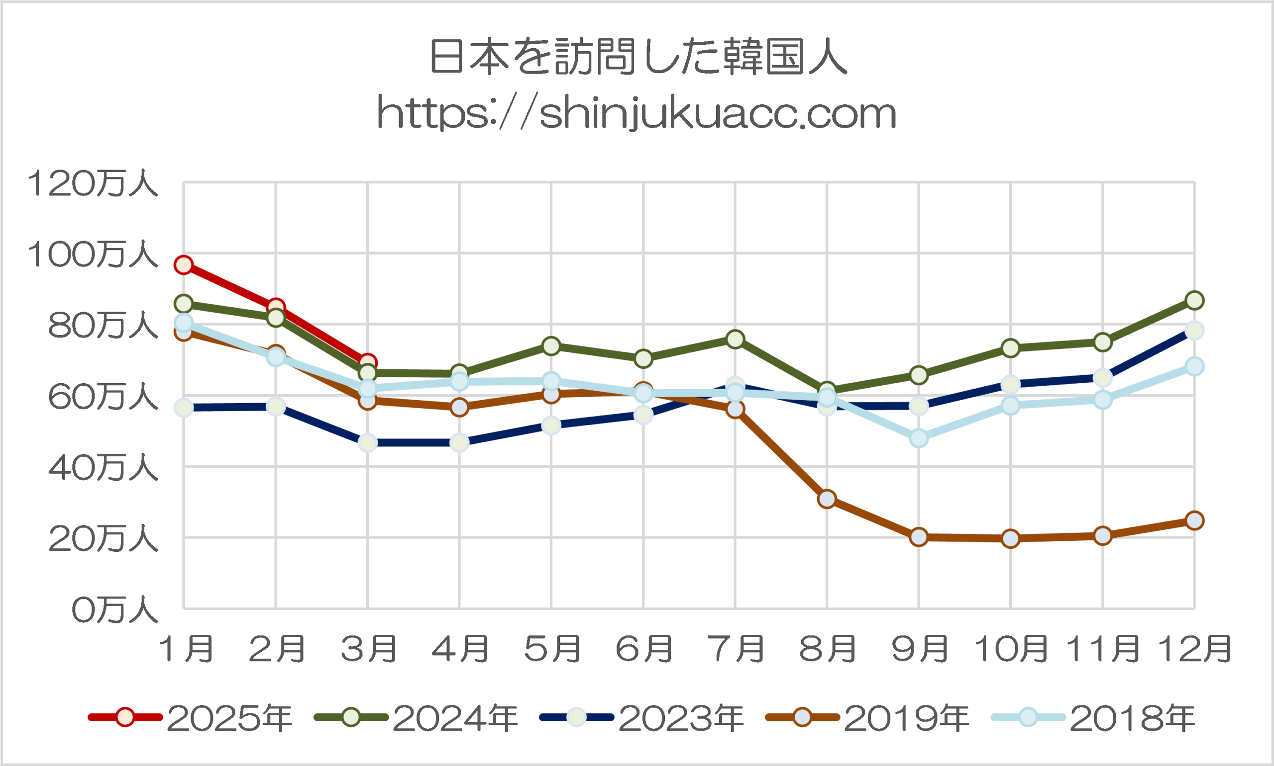 これで見ると、訪日外国人総数自体は強く伸びているのですが、訪日韓国人は3月としては過去最高水準であるとはいえ、伸び率は明らかに鈍化しており、また、訪日中国人に関しては2019年のピーク時の水準を割り込んでいます。