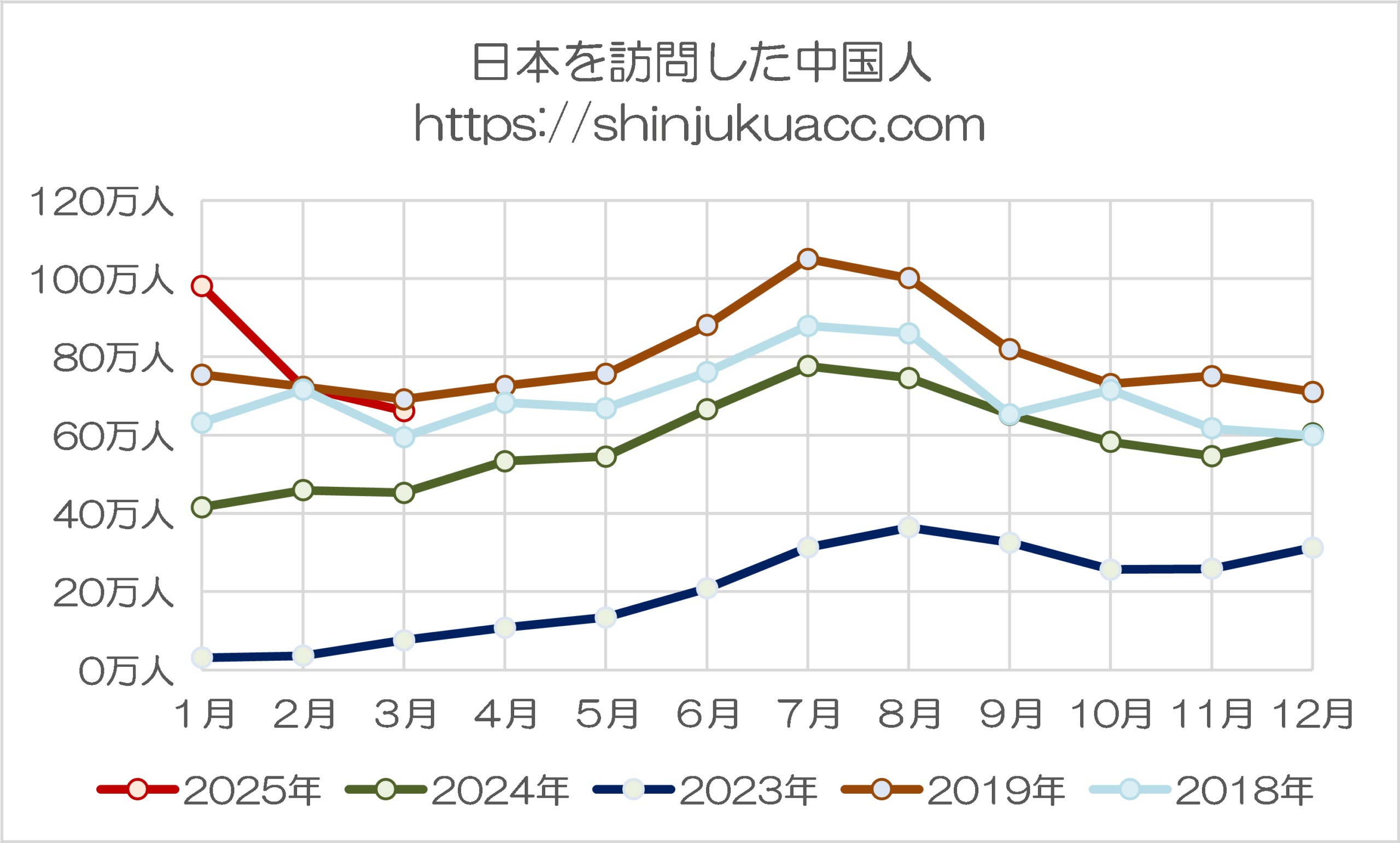そして、きんりんしょこくからの入国者数が、どうやら頭打ちになりつつある、という可能性も出てきました。図表3は、訪日外国人全体、および入国者上位5ヵ国・地域について、コロナ前の2018年、19年、コロナ後の2023年、24年、25年の5年分の入国者数を月次で示したものです。