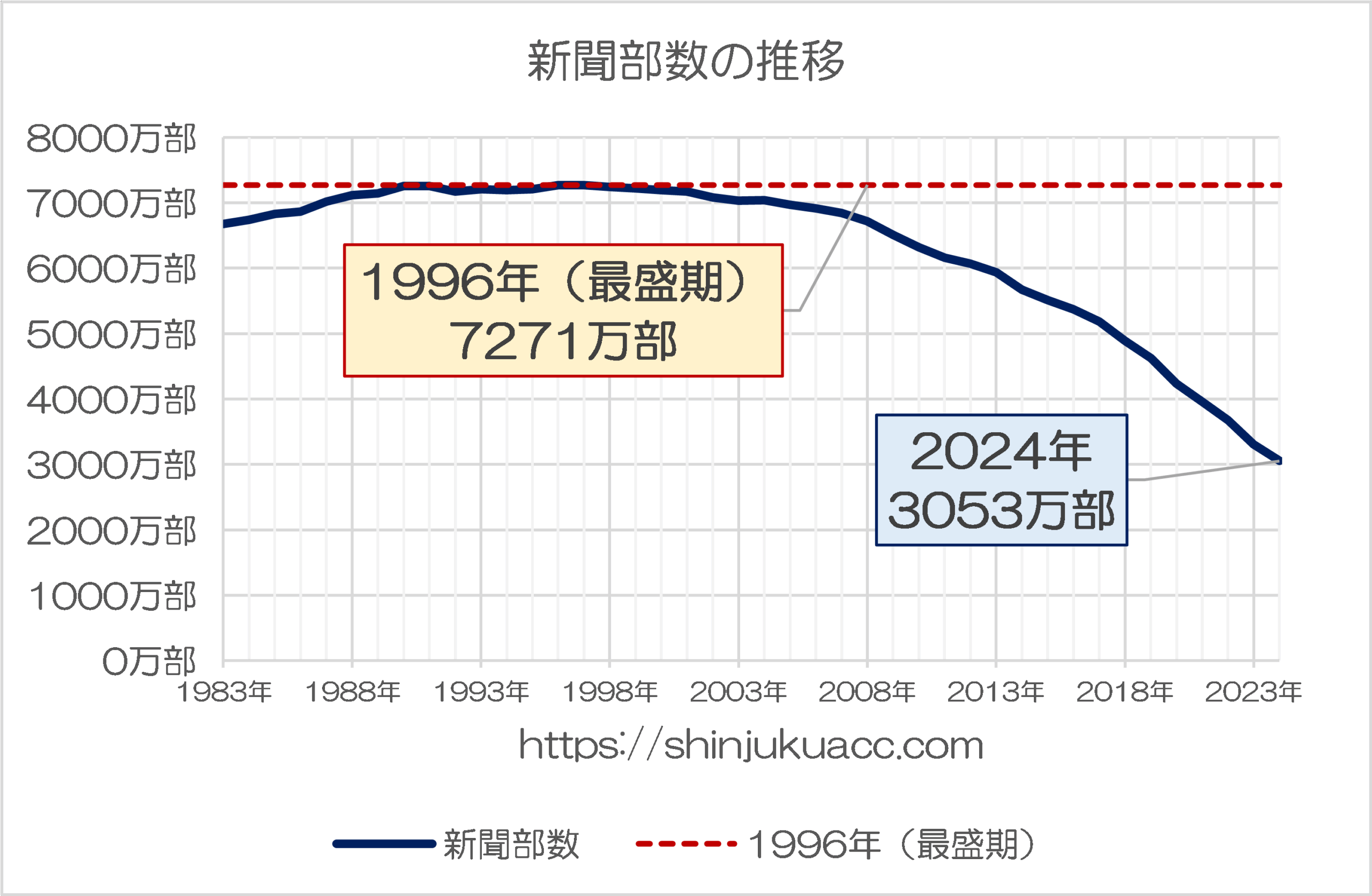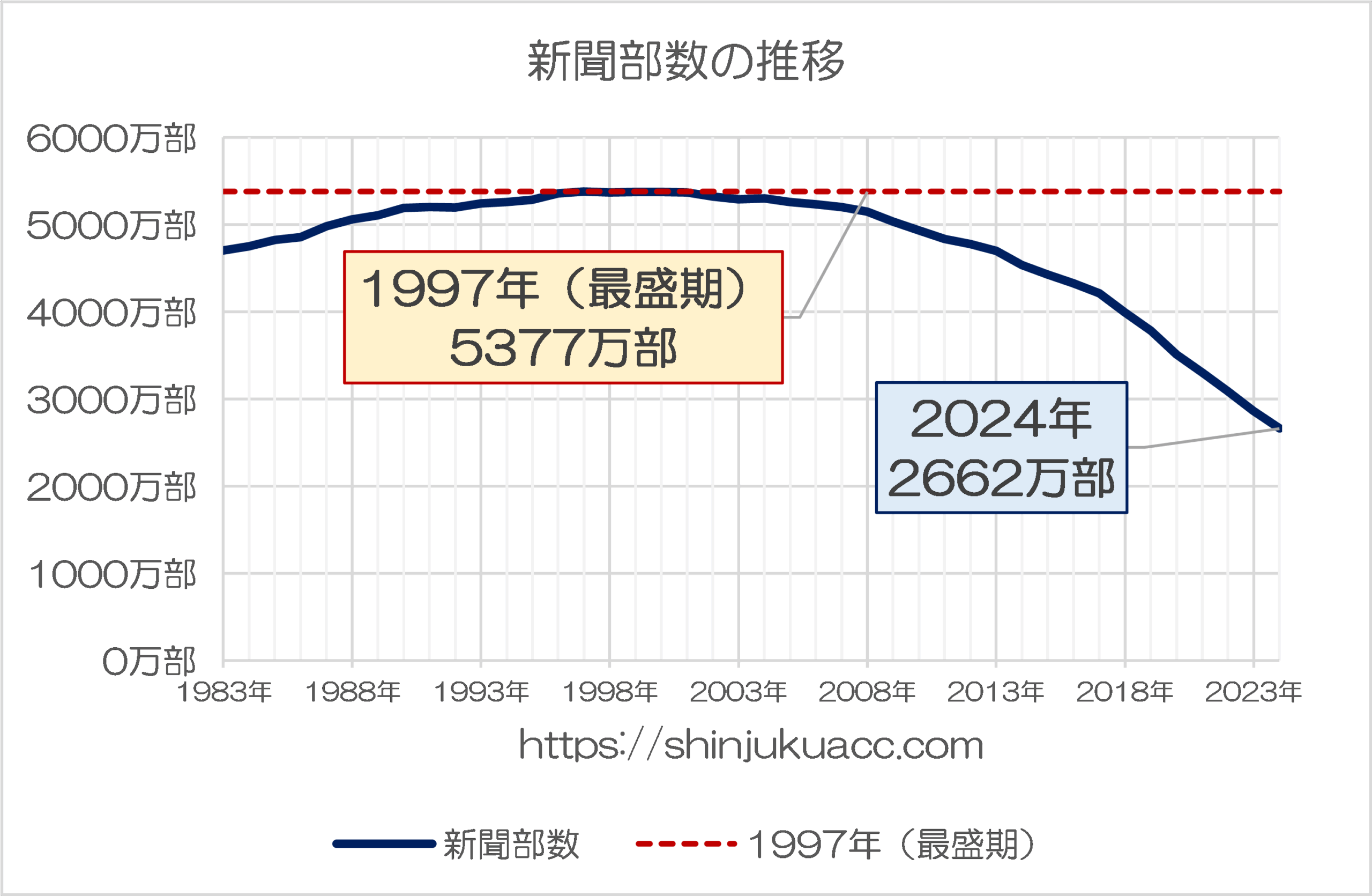 一番わかりやすいのは、一般社団法人日本新聞協会が『新聞の発行部数と世帯数の推移』というページで公表している新聞の部数でしょう。