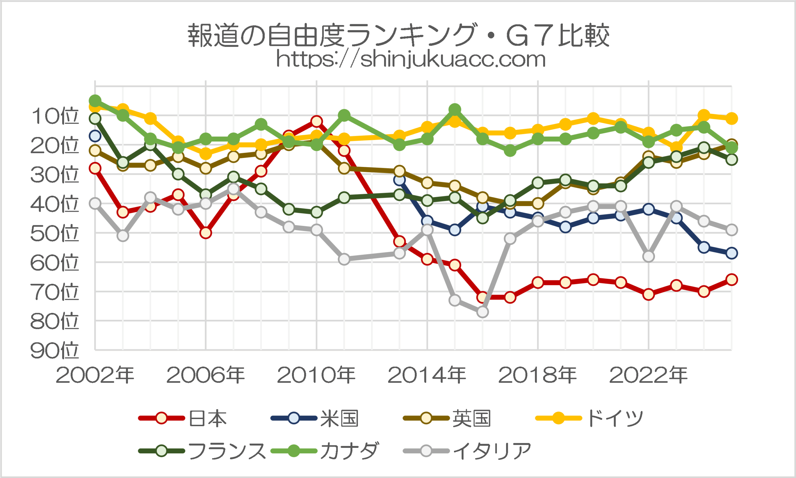 これによると2025年における日本の「報道の自由度」は世界180ヵ国・地域中66位でした。昨年の70位からランクを4位上げたものの、G7諸国で比べても、フランスに次いで低いのです(図表2)。