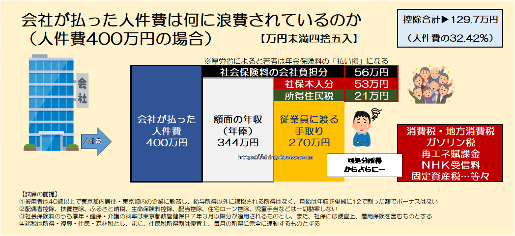 つまり、(その人の年収にもよりますが)企業が支払った人件費の3分の1、酷いケースだと4割前後が税、社保などとして召し上げられられてしまうのです。