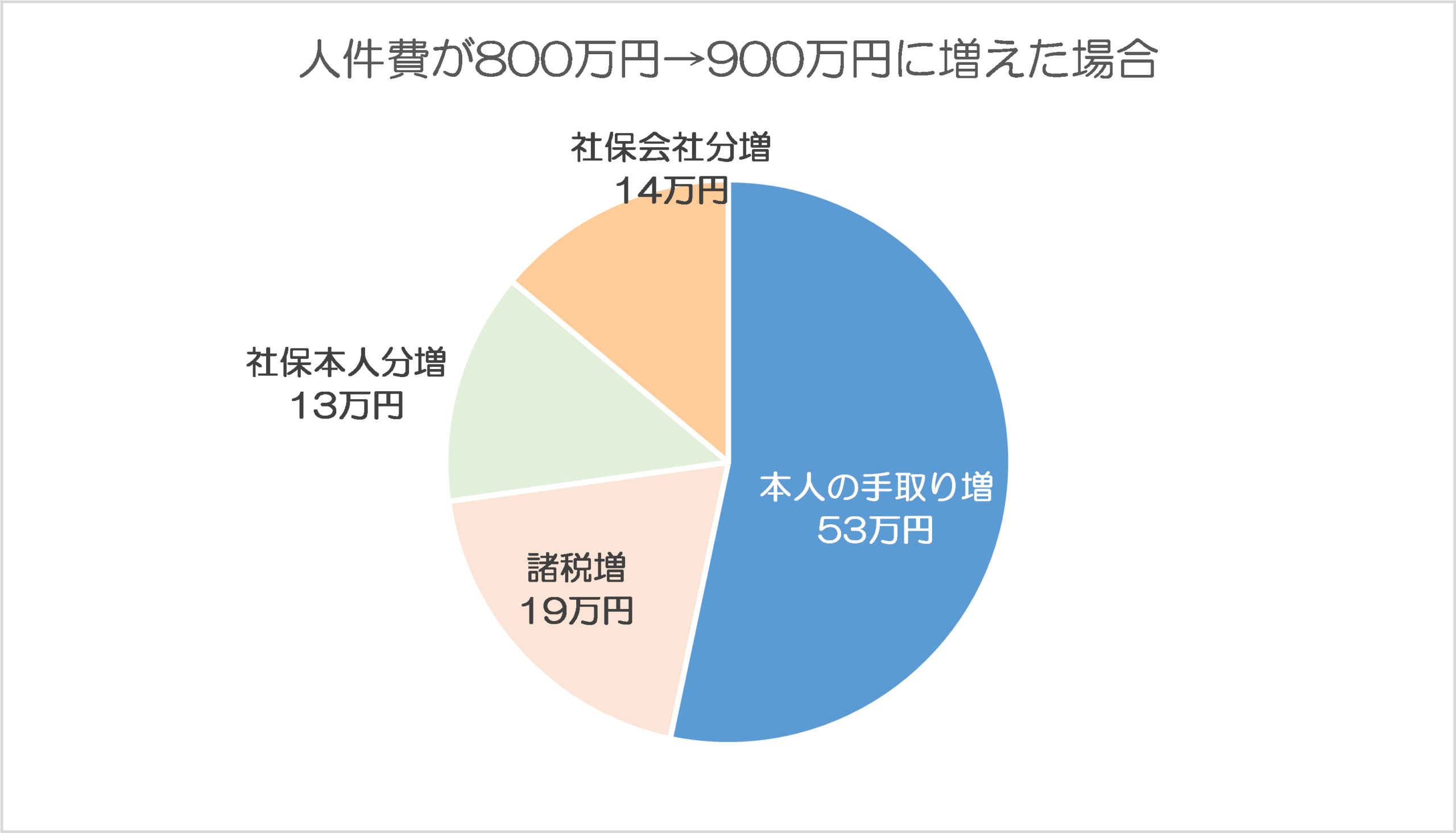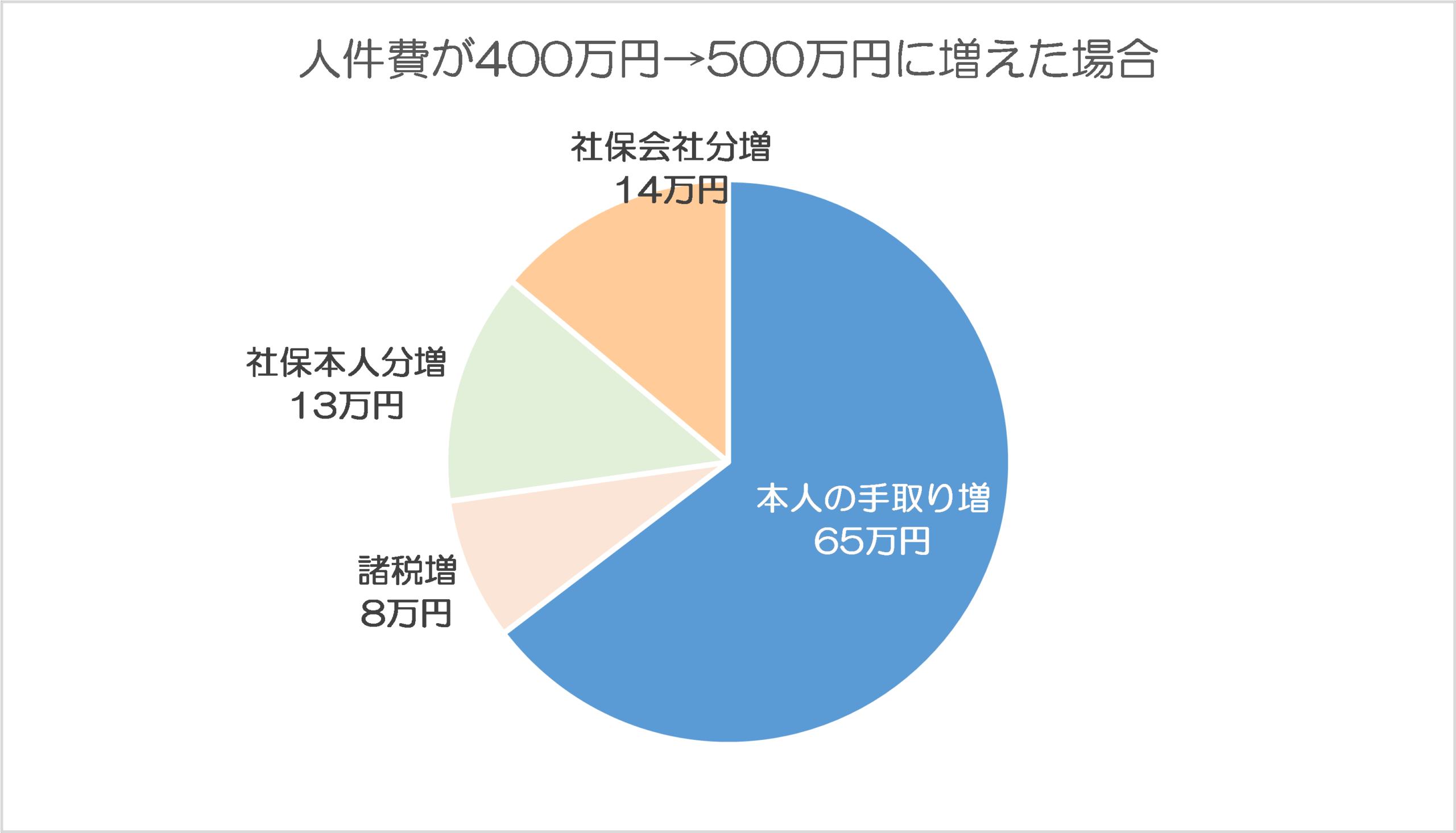 概算ですが、人件費が400万円から500万円へと増えたとしても、本人の手取りが増えるのは約65万円に過ぎず、残りは社保(会社負担分と本人負担分あわせて約27万円)、所得税・復興税・住民税・森林税など(約8万円)に消えます。