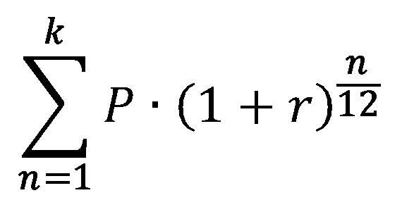 「毎月定額でP円積み立て、年r%複利で運用し続ける」とします。これをkヵ月続けた場合の金額は、次の計算式で表せます(※ただし、計算を簡単にするため、1年未満は月割計算とします)。