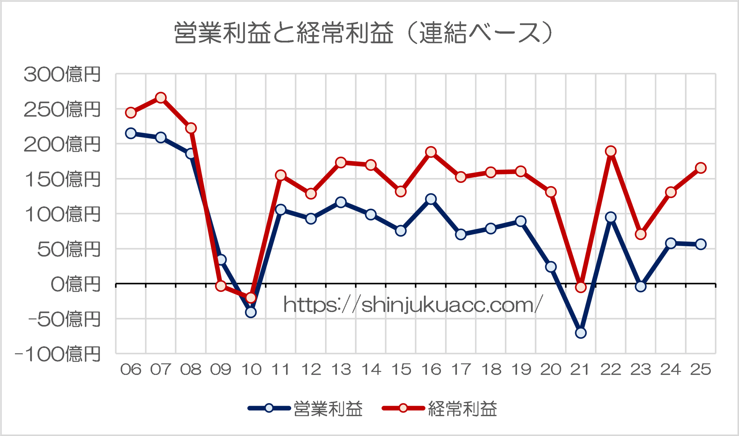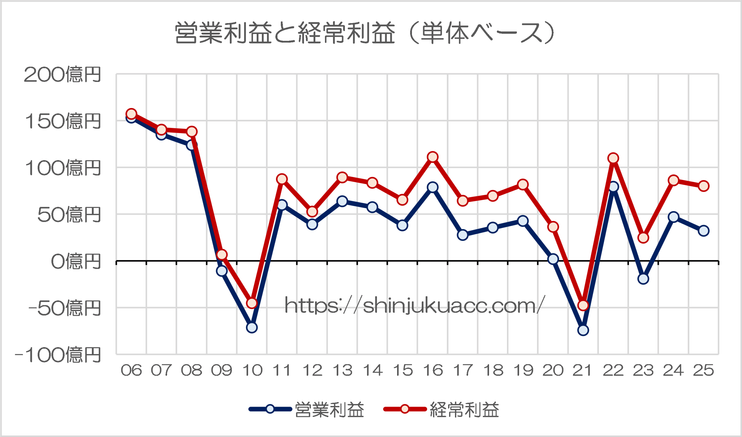 この20年間で見て、同社が単体ベースで営業赤字に転落したのは過去に4回ありますが(2009年3月期、10年3月期、21年3月期、23年3月期)、それ以外の年度で見ても、営業利益が100億円を超えていたのは2008年3月期以前の3期のみです。