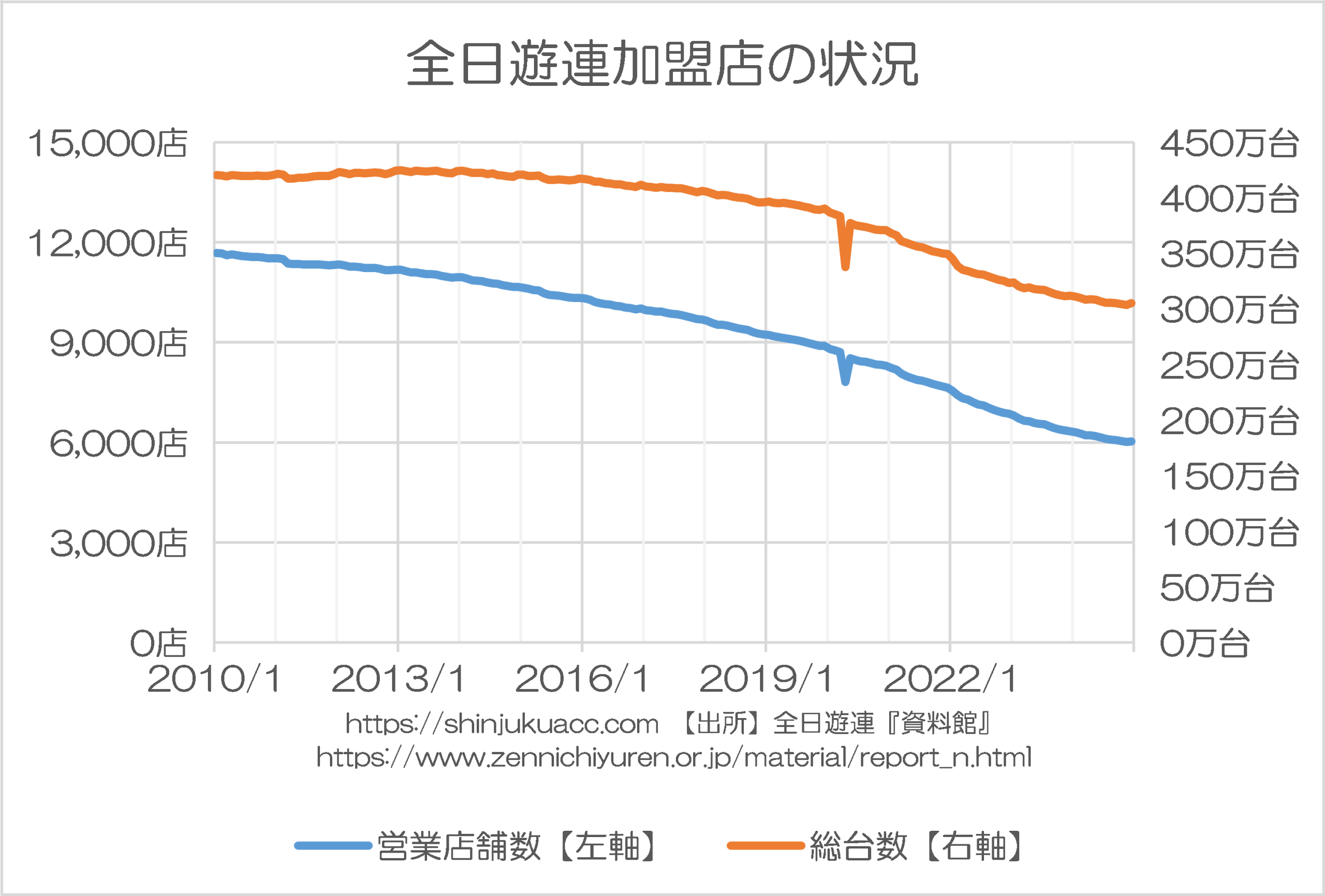 これについては全日本遊技事業協同組合連合会(略称「全日遊連」)が『資料館』というページで、『全国遊技場店舗数及び機械台数(警察庁発表)』、『組合加盟店舗の実態調査結果』という2つのデータを公表しているのが参考になるかもしれません。