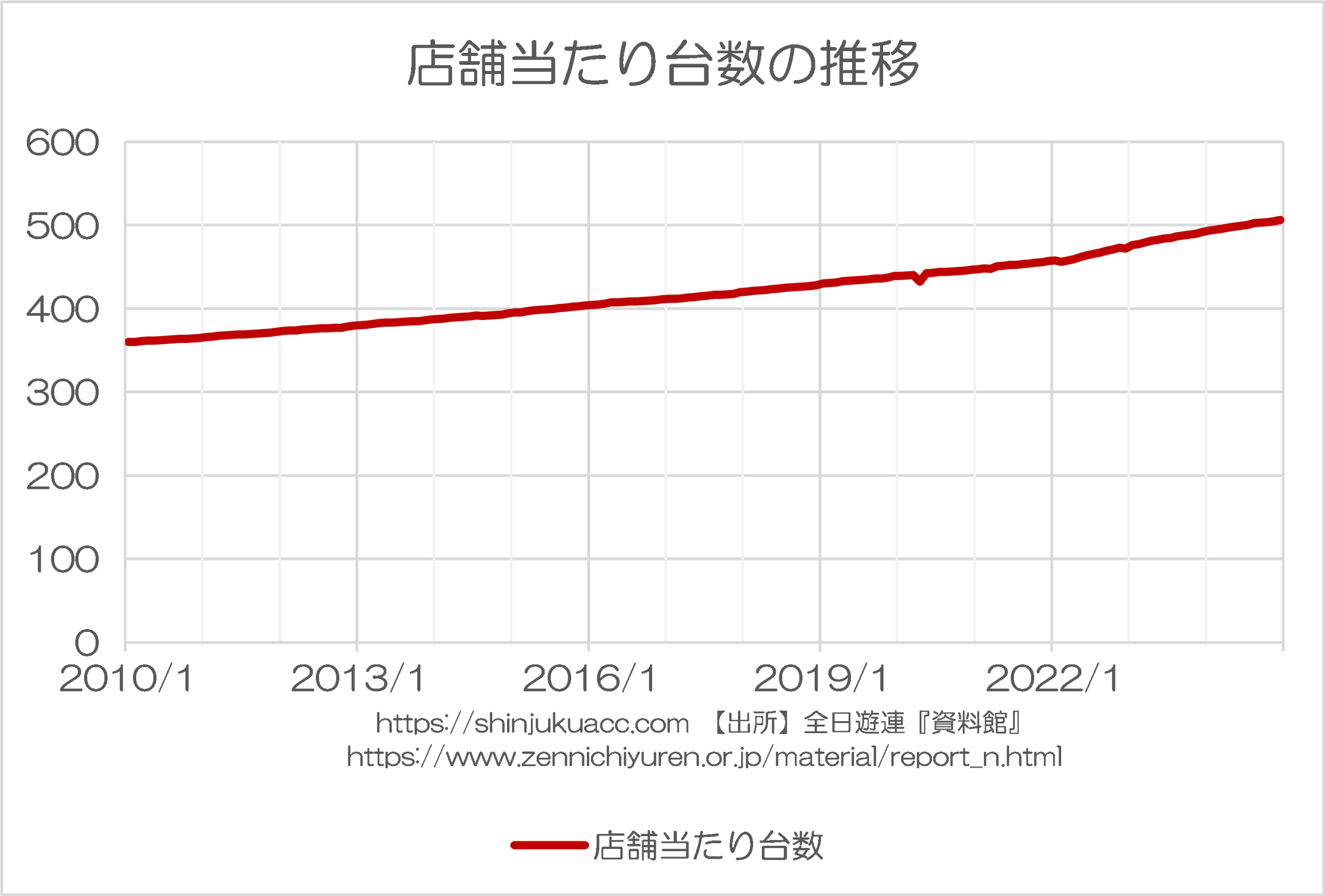 実際、台数を店舗数で単純に割った「店舗当たり台数」の推移を取ってみると、2010年ごろは店舗あたり平均して360台程度だったパチンコ・パチスロの台数が、直近の2024年12月だと506台に増えているのが確認できます(図表2)。