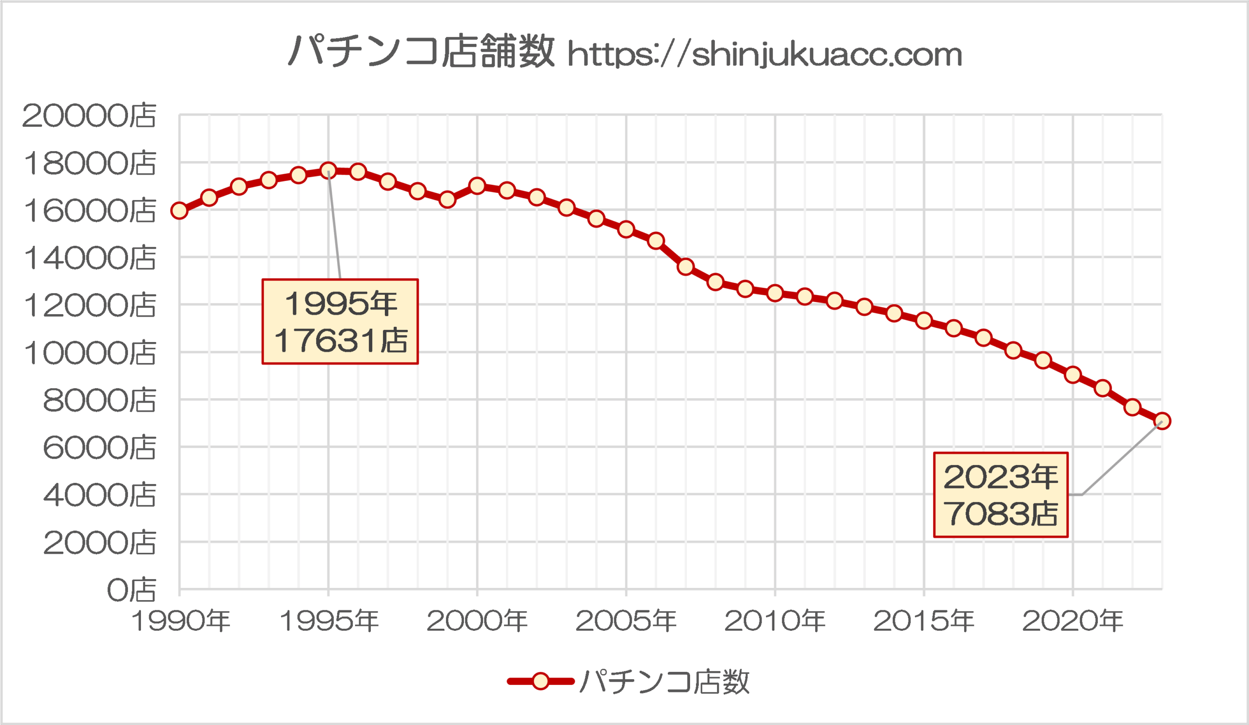 ところで先ほど、全日遊連のウェブサイトには『全国遊技場店舗数及び機械台数(警察庁発表)』というデータもある、とお伝えしましたが、こちらのデータについては現時点でまだ2024年までのデータの更新がなされていないものの、平成元年、つまり1989年までデータを遡ることができるため、有益です。