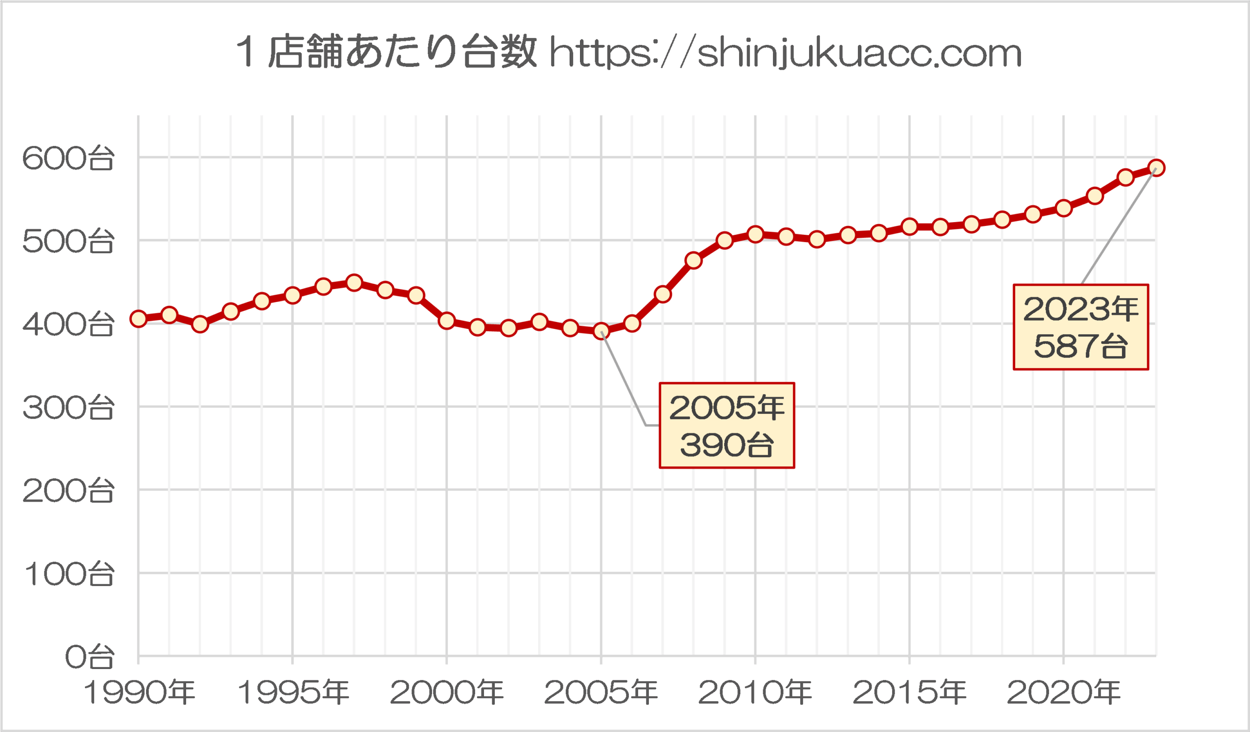 ただ、2010年1月と24年12月を比べると、店舗はおよそ半減していますが、台数自体は4分の1程度しか減っていません。というのも、直近の台数は3,050,021台で、同サイトで遡れる最も古いデータ(2010年1月)では店舗が11,675店、台数は4,201,688台だからです。