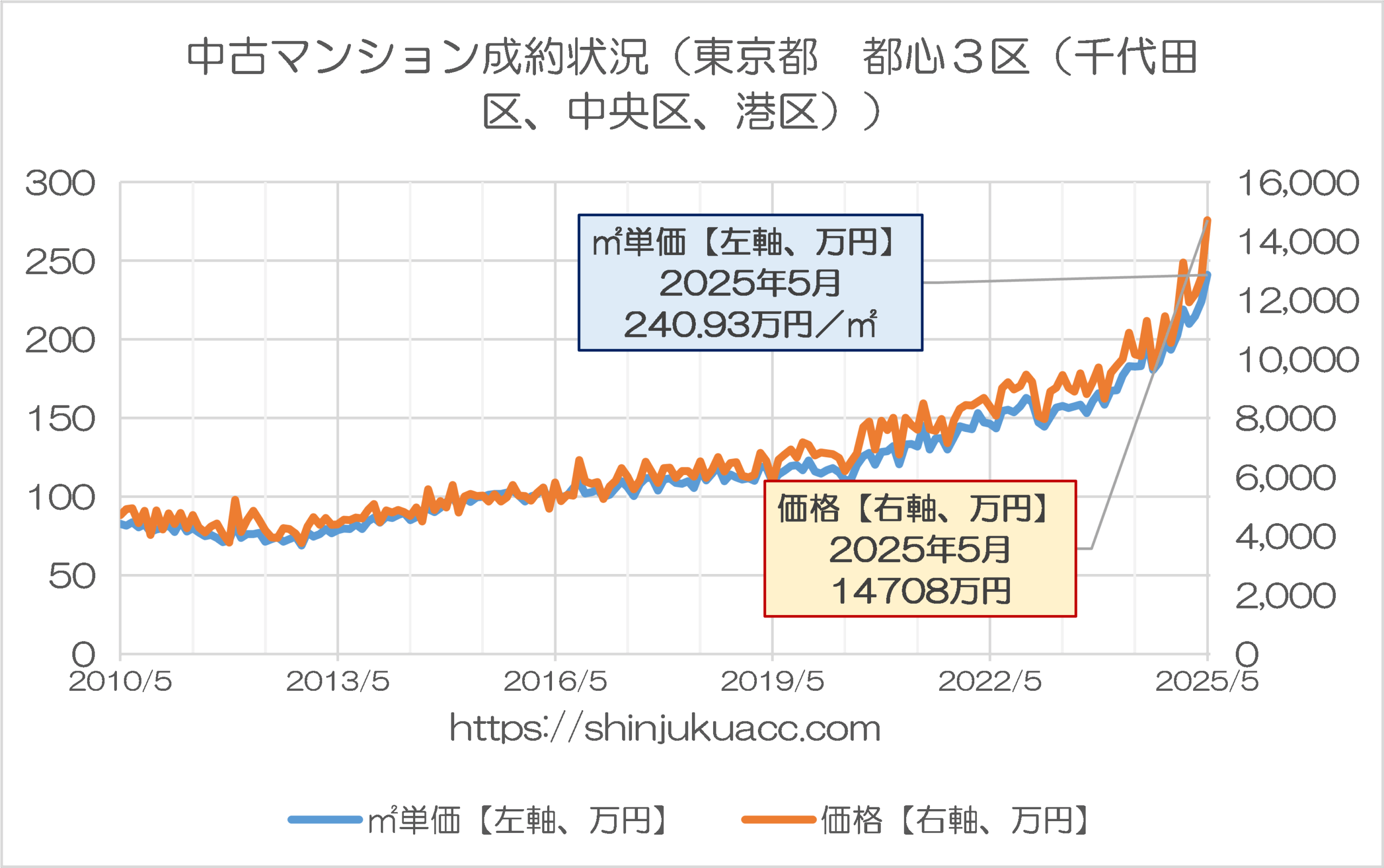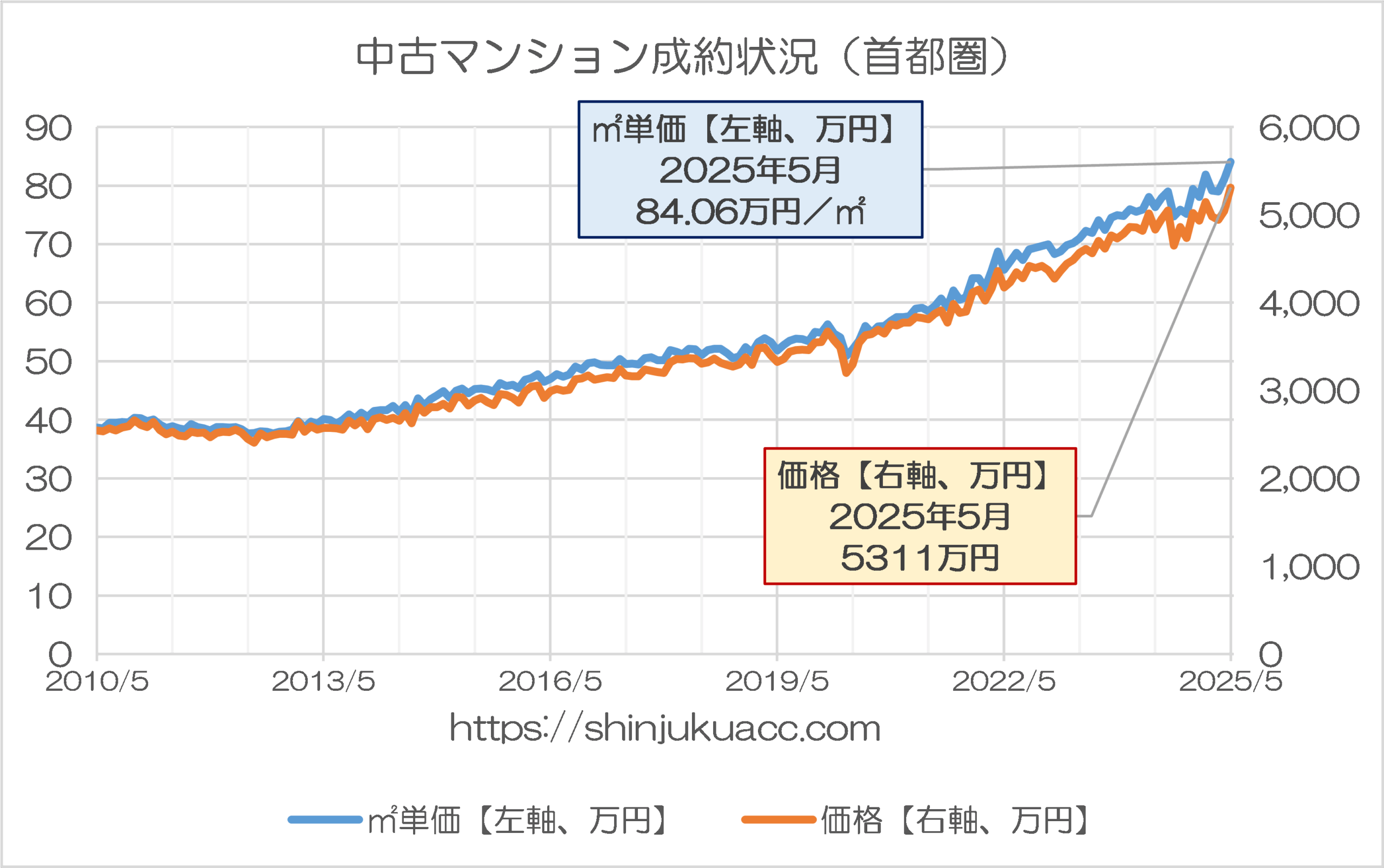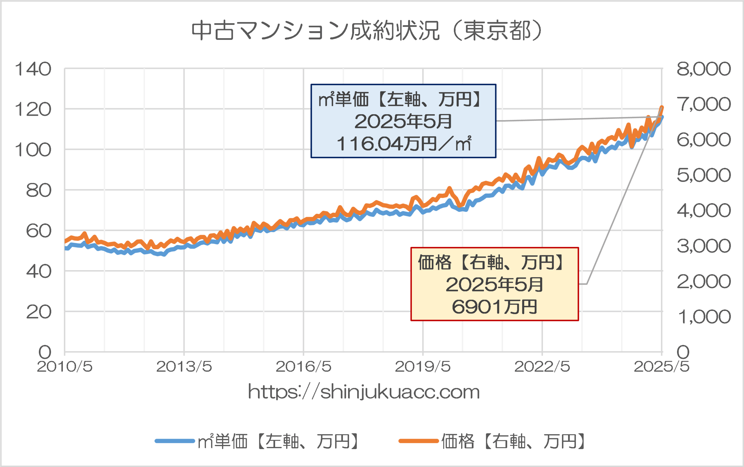 その東日本レインズが10日、2025年5月までの中古マンション価格データを公表したのですが(東日本レインズ『レインズデータライブラリー』参照)、驚いたことに、東京都内のマンションの平米単価は、一気に過去最高を更新したようです。