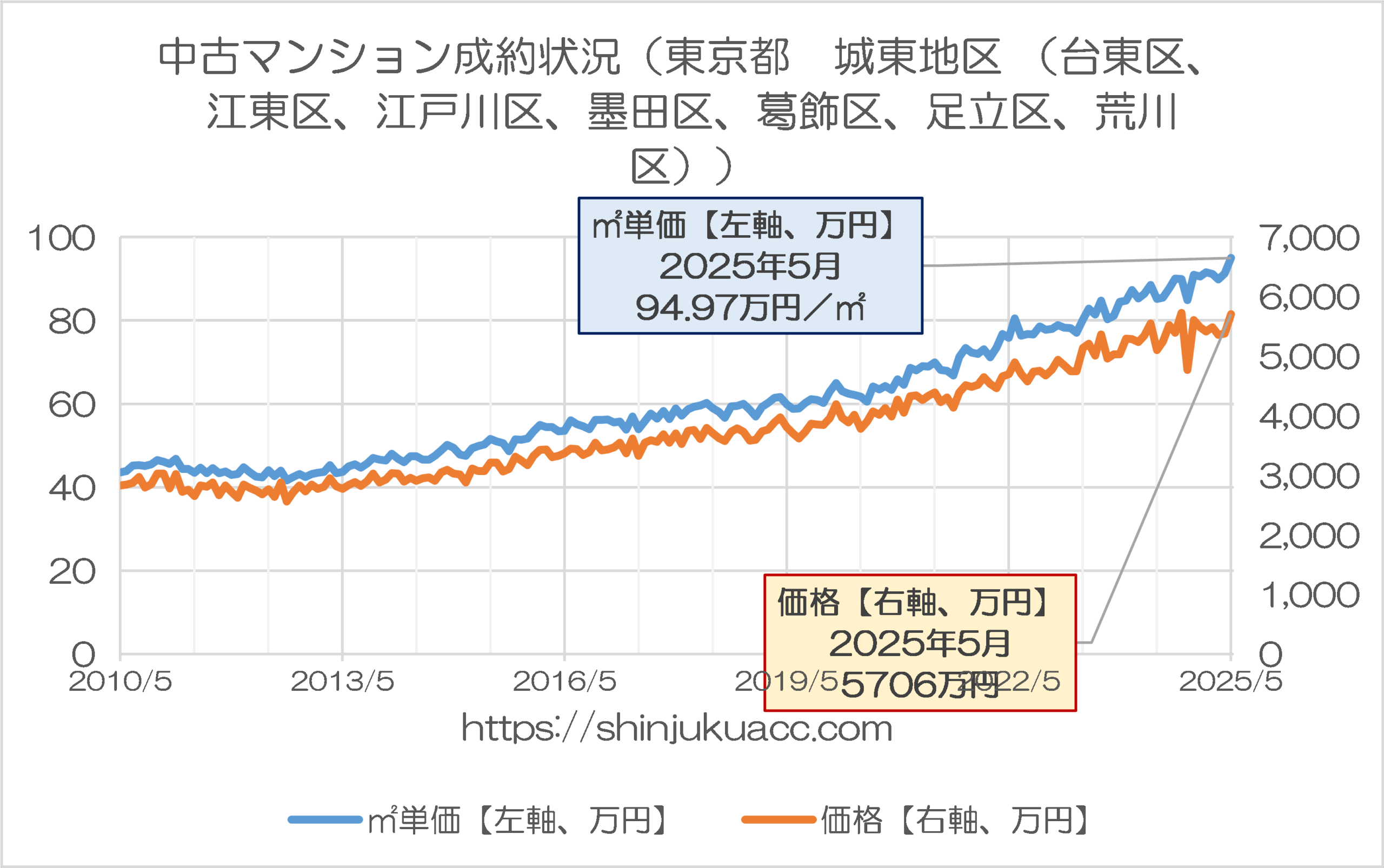しかし、城東地区だと平米単価は94.97万円/㎡で、上昇率こそ前月比4.02%、前年同月比11.55%ですが、価格水準自体は都心3区に比べて半分以下であり、また、上昇傾向が続いているにせよ都心3区ほどの極端さはありません。
