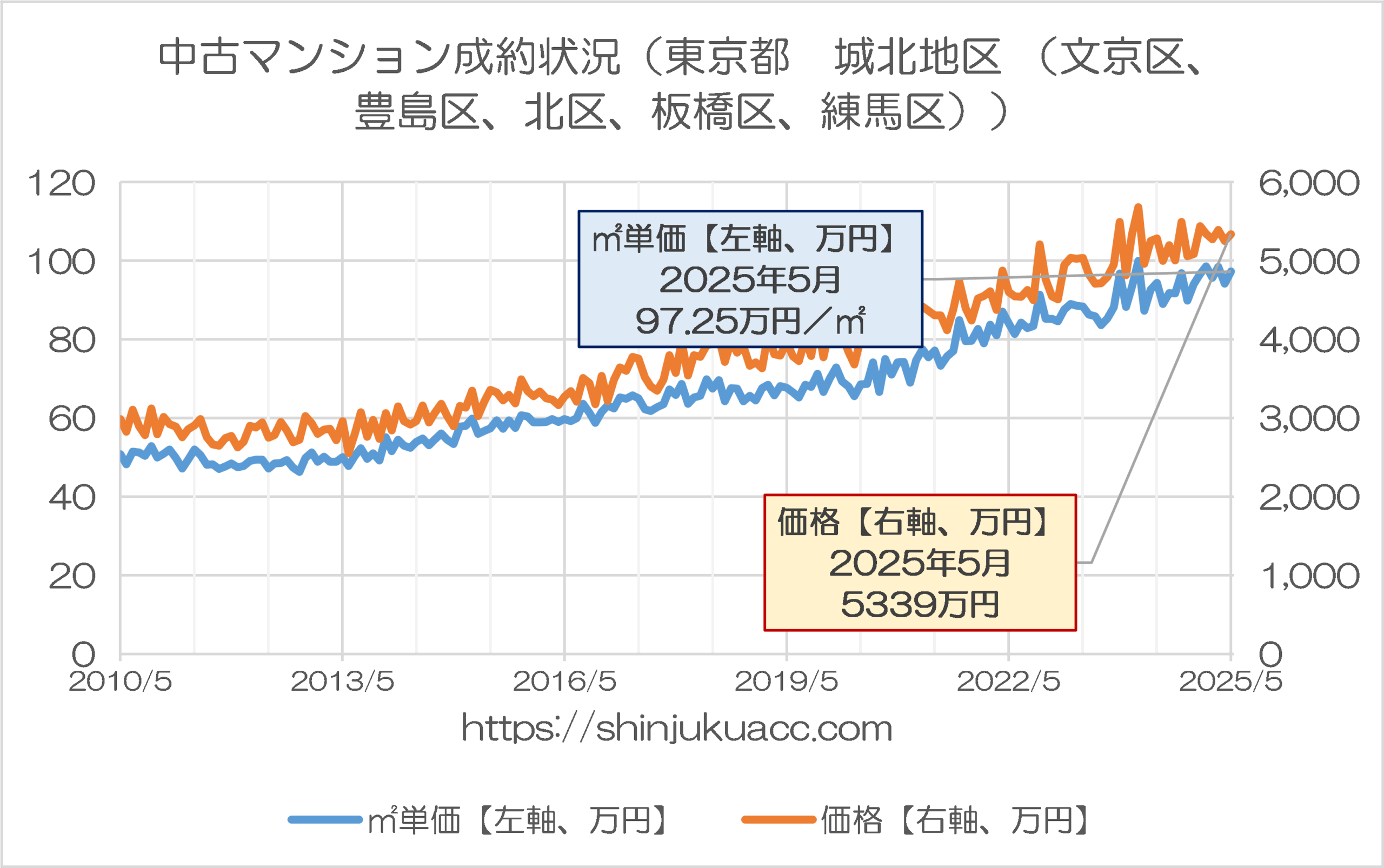 また、城北地区に関しては平米単価97.25万円/㎡、グラフの形状的にも上昇トレンドは続いているにせよ、上昇率は前月比で3.23%、前年同月比で3.10%と、都心3区や城西地区などと比べて上昇ペースは緩やかです。