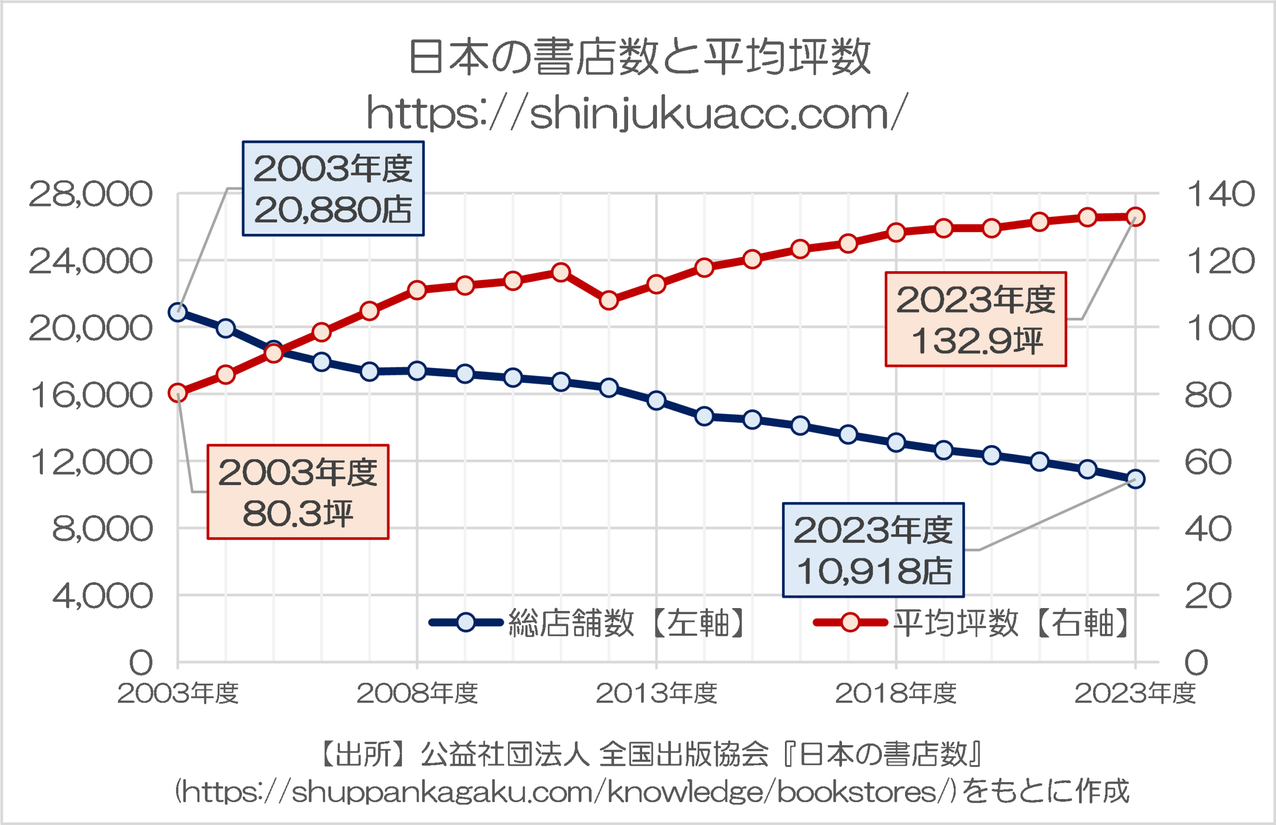 ただ、店舗当たりの坪数(判明するもののみ)については、2003年度の80.3坪から2023年度は132.9坪に増えるなどしており、書店業界には店舗の大型化傾向があることはおそらく間違いないといえるでしょう。