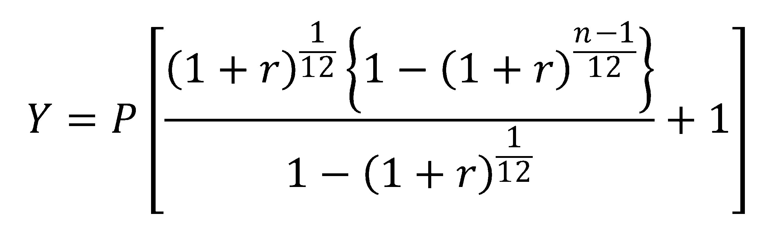 たとえば、私たちがnヵ月間、毎月末にP円の年金保険料を拠出し、それを複利r%で運用した場合、退職した時点でY円のファンドが貯まっているはずです。この前提条件だと、正確な計算式は次の通りです(ただし、複利回りの計算は月次で行うものと仮定しています。また、退職はnヵ月目の月末に行うものとします)。