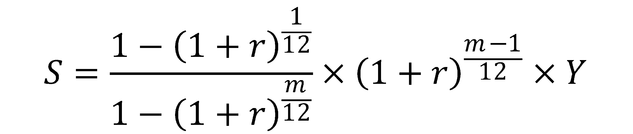 その一方で、この人は退職後、毎月の初めに一定額ずつの年金を受領し続け(つまり最初の年金は退職日の翌日に受け取るものとします)、この状態がmヵ月後に天に召されるまで続くとすると、受け取れる毎月の年金額Sは次の計算式で求めることができます。