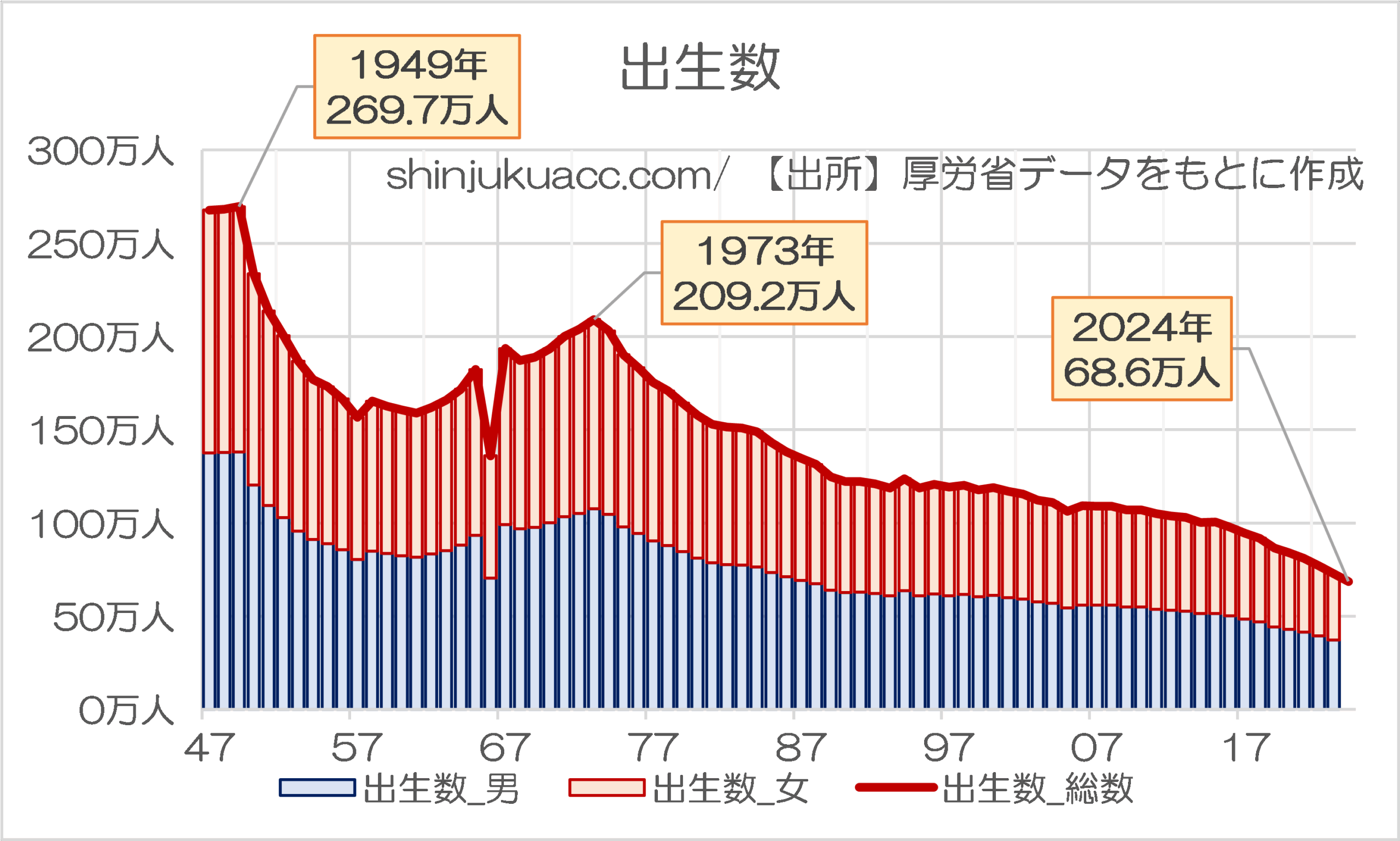 なんといっても先日、厚労省から公表された『人口動態統計月報年計』で、2024年を通じた出生数が68万6061人と統計がある1947年以降で見て初の70万人割れを起こし(図表1)、過去最低を更新したことで、一部メディアは「社会保障の持続可能性」を巡る疑義を提起しているほどです。