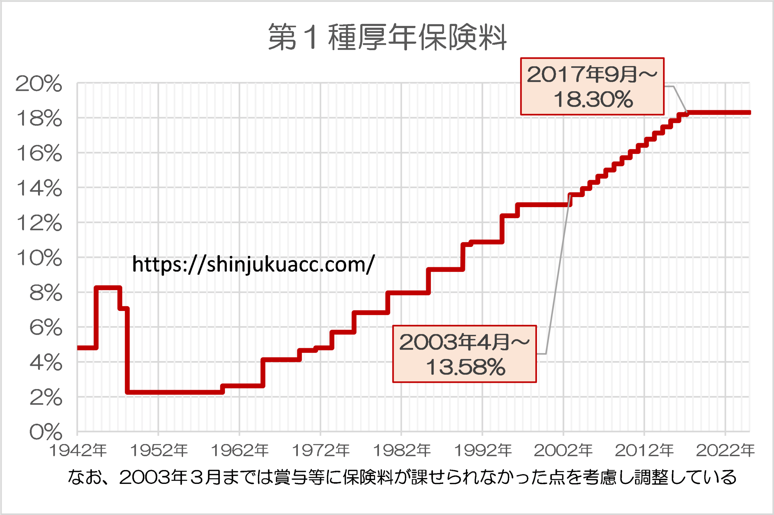 (【出所】日本年金機構『厚生年金保険料率の変遷』をもとに作成。2003年3月以前の分については0.75を乗じる調整を加えている)