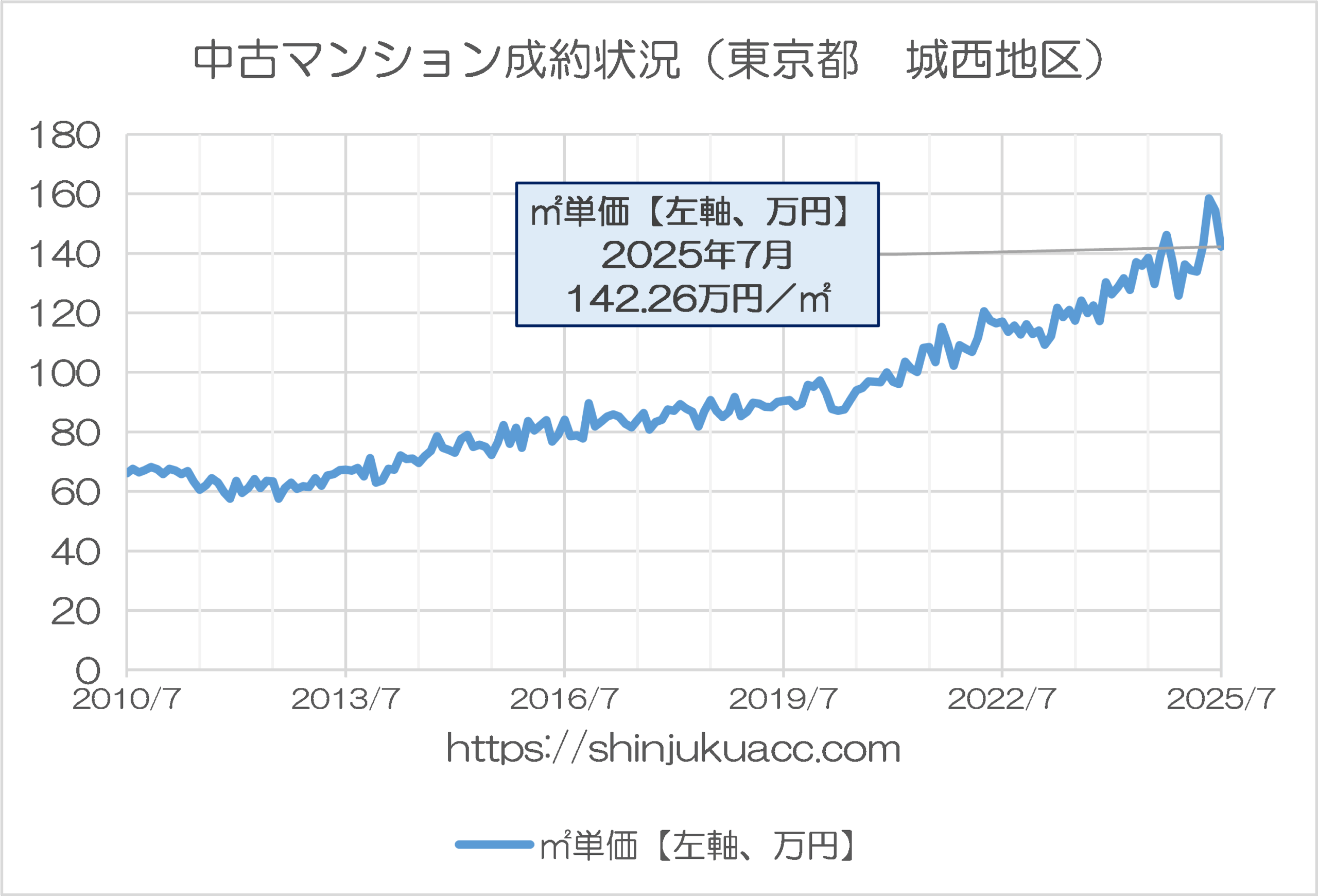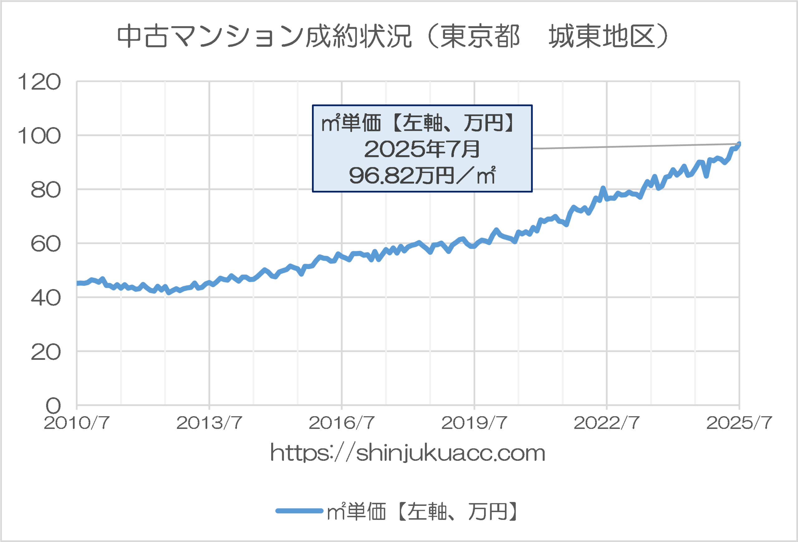 当ウェブサイトで最近よく取り上げる公益財団法人東日本不動産流通機構(東日本レインズ)が公表する首都圏の中古マンション成約データで見ると、東京都心部を中心に、中古マンションの上昇基調が続いています。