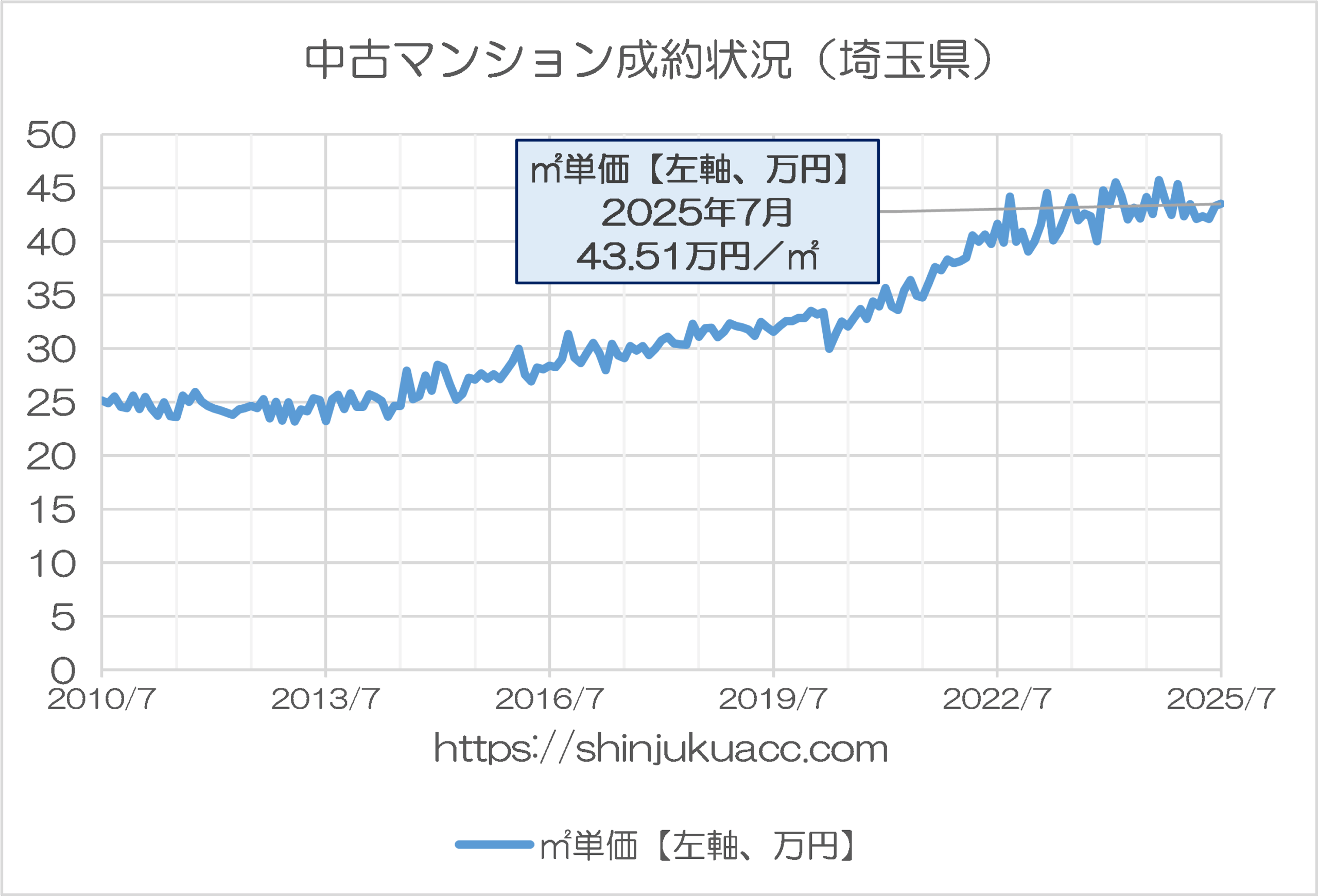 平米単価でみてみると、東京のとりわけ都心部など(図表1)は急速な上昇が続いているのですが、東京都の周辺3県に関していえば、そこまで極端に上昇しておらず、むしろここ2~3年で見れば価格上昇は天井を打った感すらあります(図表2)。