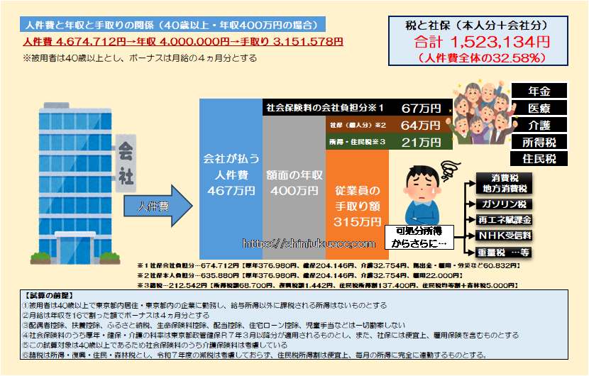 実質的な年収は400万円ではなく467万円であり、手取り315万円との差額152万円がこの人の負担で、しかも社会保険料(※労使合計)の131万円が、高齢者の異常に手厚い年金や野放図な医療費に浪費されているわけです。