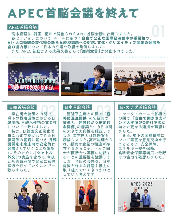 高市総理によるAPEC首脳会議出席等の概要です。 pic.twitter.com/JshtIISuvF