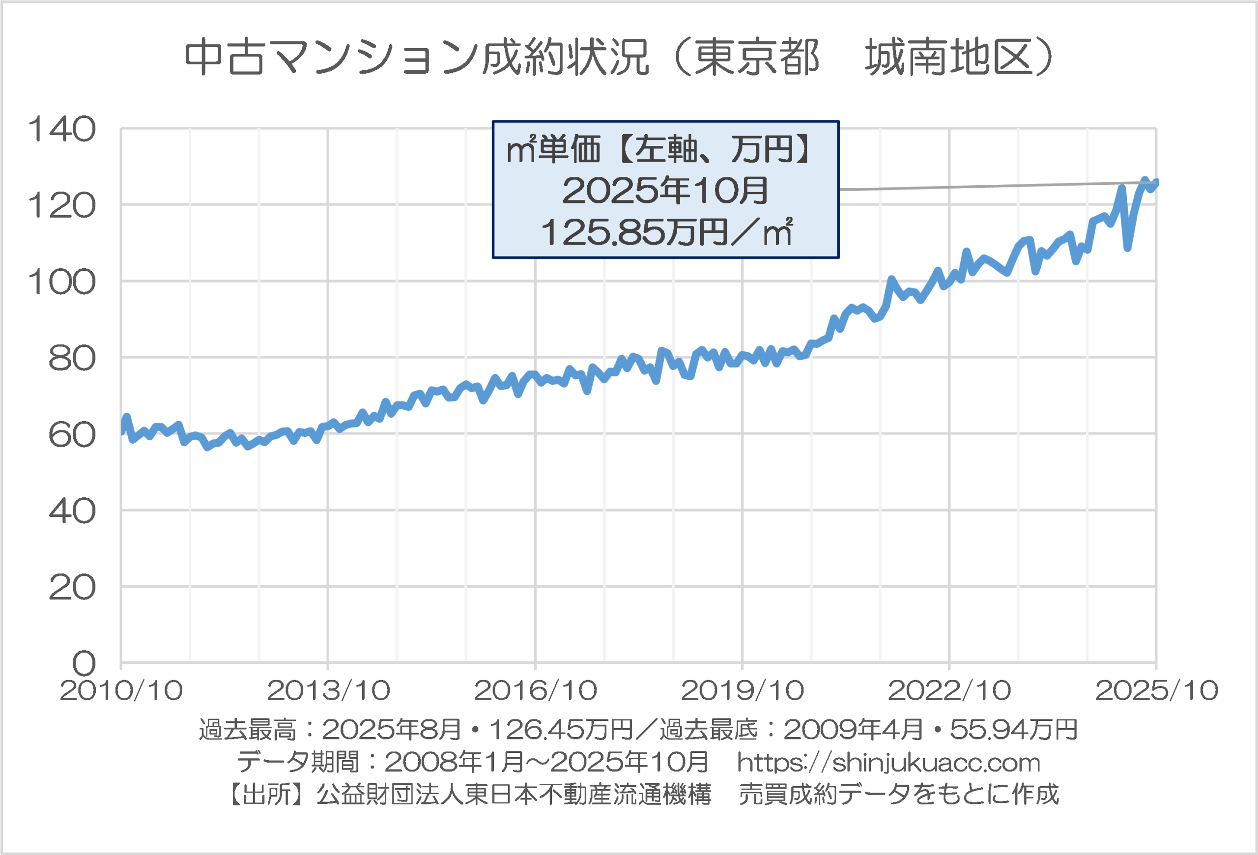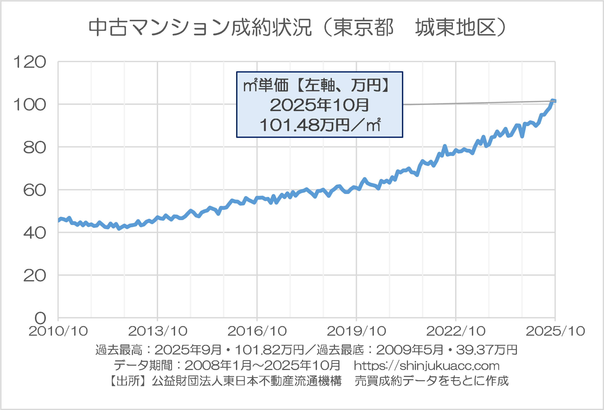 直近の2025年10月は103.97万円と過去最高を更新しており、データが存在する中で比べて過去最低だった2009年6月時点の44.63万円と比べれば2.3倍に上昇していますので、やはり価格上昇が激しいことに間違いはありませんが、それでも都心3区や城西などと比べると「控え目」です。