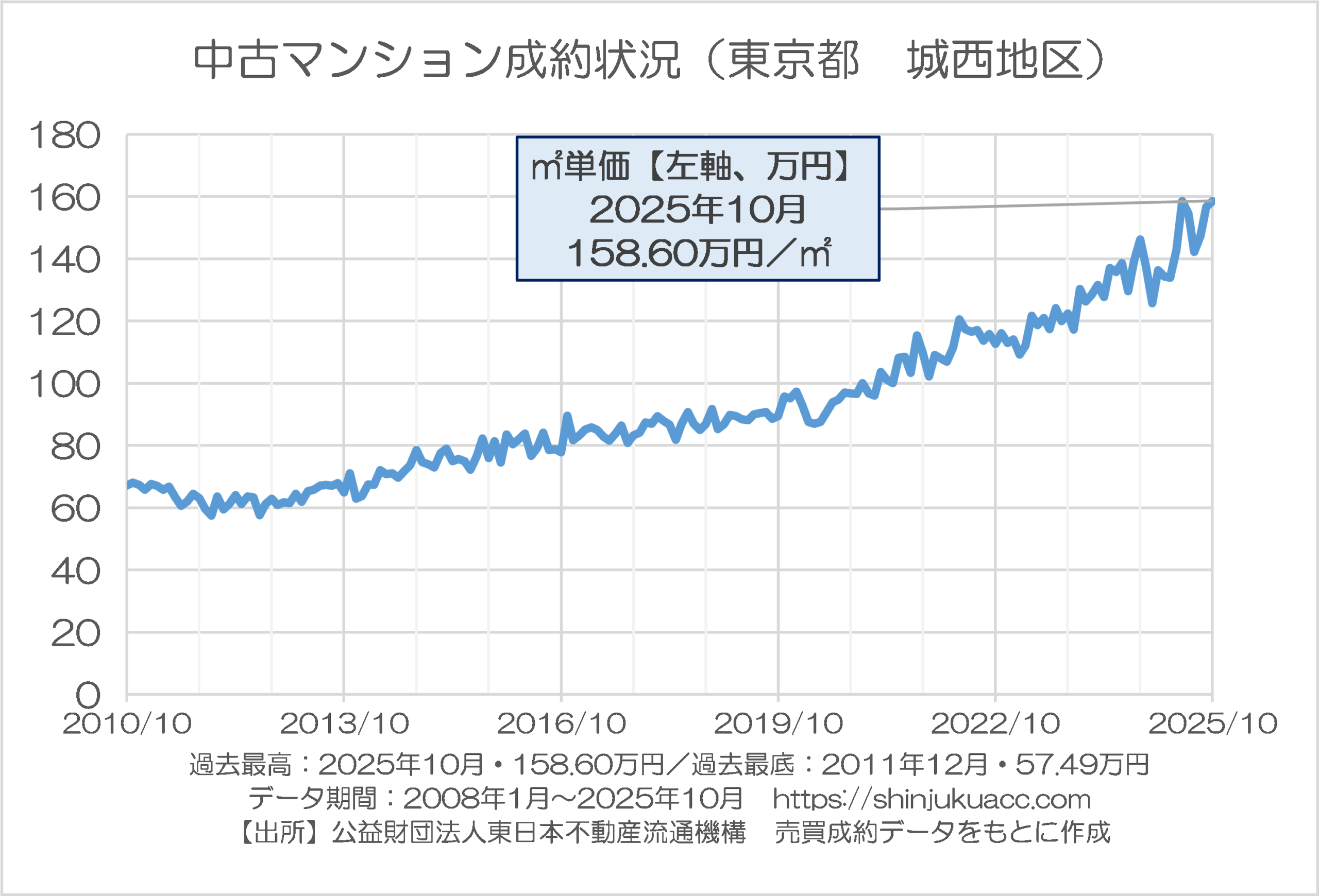 データが存在する2008年以降で見て過去最低だったのが2011年12月の57.49万円ですので、もしこの時点で不動産を取得していれば、価格はじつに2.76倍になった、という計算です。20平米の物件でも3000万円を超えてしまいますし、70平米で「億ション」になってしまいます。