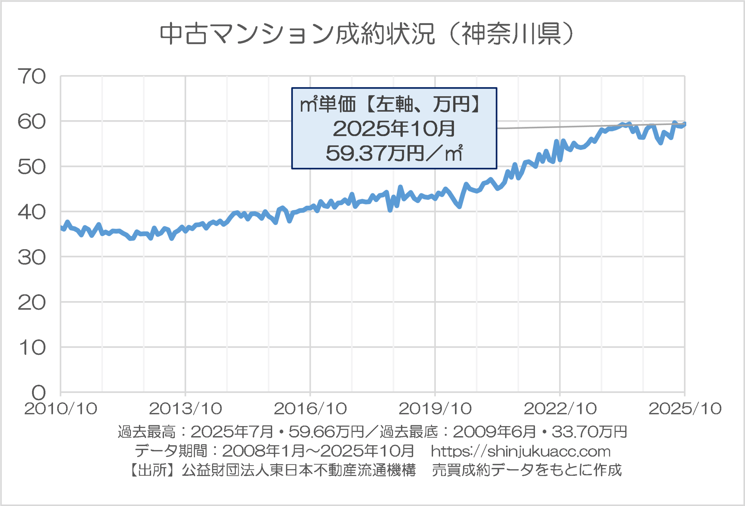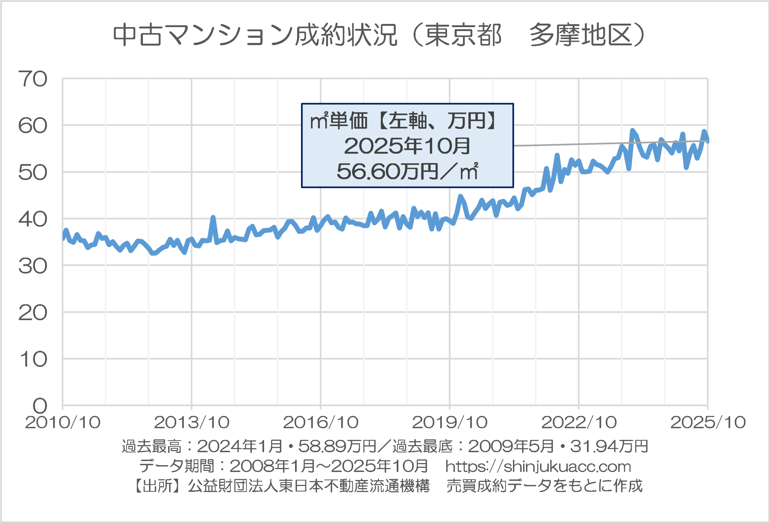 こうしたなか、東日本レインズは11日、2025年10月分の売買動向に関する最新版レポートを公開していますので、さっそくこれを入手し、売買成約データのうち平米単価のみを抜き出してその動向を確認してみましょう。