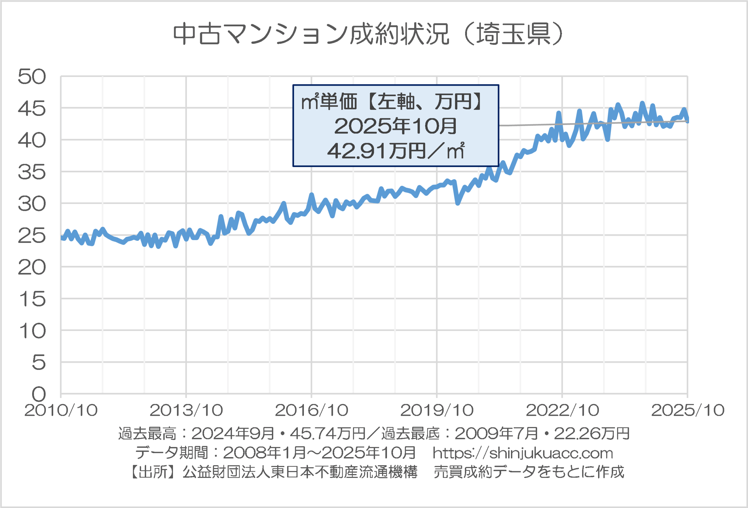まず埼玉県ですが、直近・2025年10月において平米単価42.91万円で、データが存在するなかでの最低値、つまり2009年7月の22.26万円と比べると2倍近くになっているものの、価格上昇ペースは東京都と比べて明らかにマイルドです。