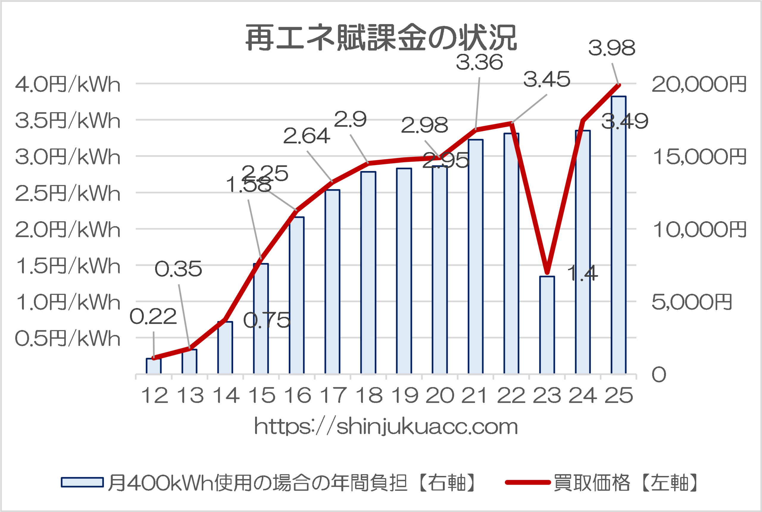 ちなみに再エネ賦課金の現在の金額(2025年5月以降分)は1kWhあたり3.98円とされ、電力を毎月400kWh使用する家庭の場合は毎月約1,600円、年間だと2万円近く余分に電気代を支払わされている計算です(図表1)。