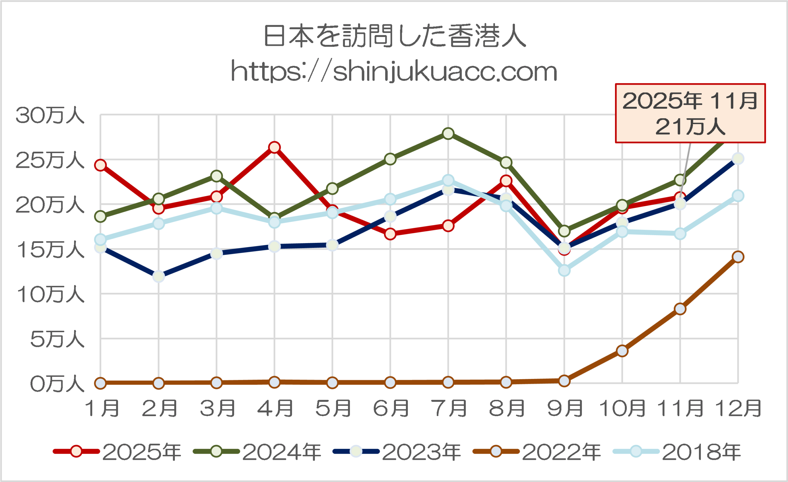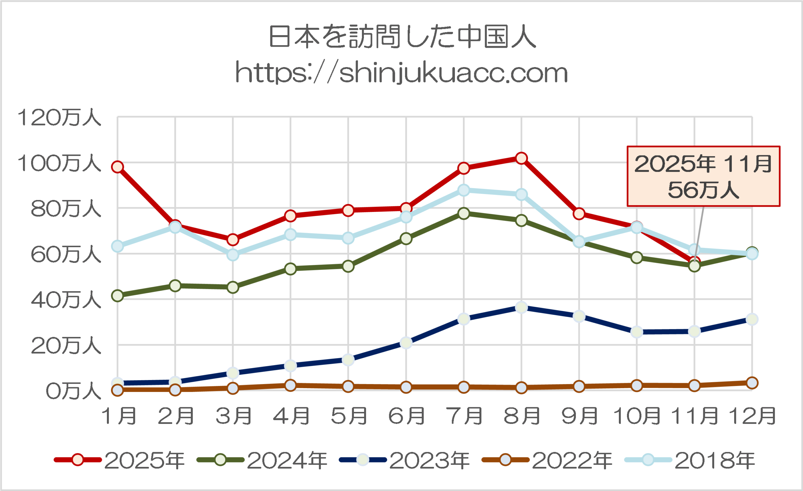 中国で始まったノージャパンの影響、現時点では少なくともほとんど確認できません。日本政府観光局(JNTO)が昨日公表した『訪日外客統計』によれば、2025年11月に日本に入国した外国人は351万8000人と、11月としては過去最大を記録。1月からの11ヵ月間累計ではなんとf3906万5627人と、年間を通じた訪日客も過去最大となったからです。