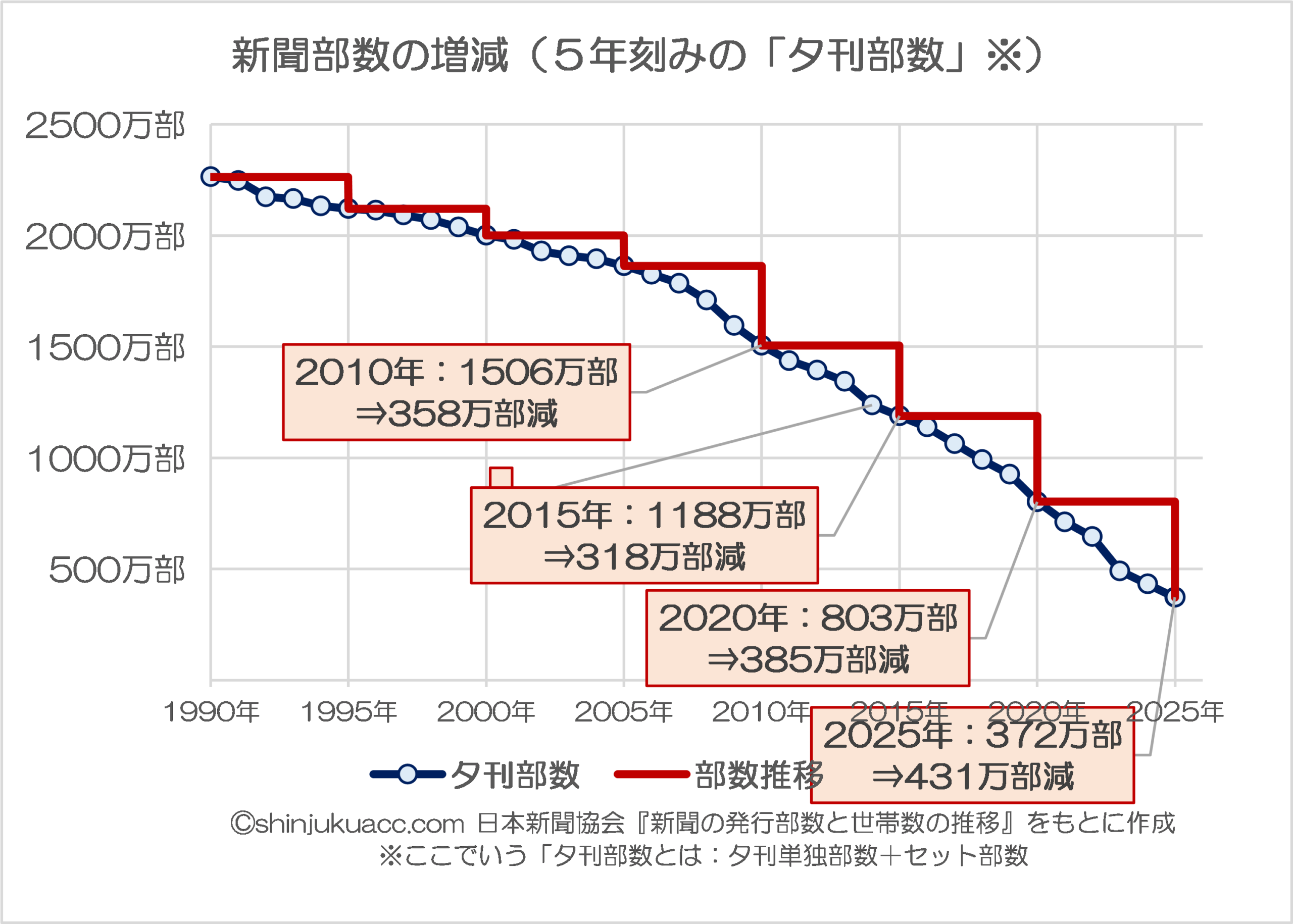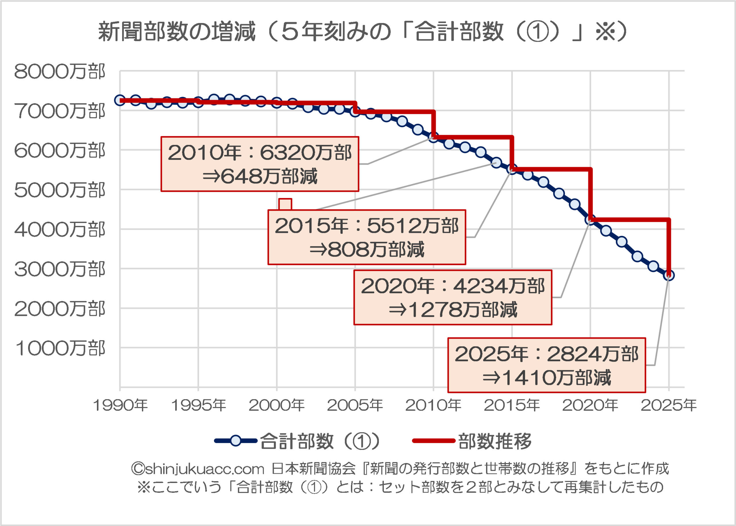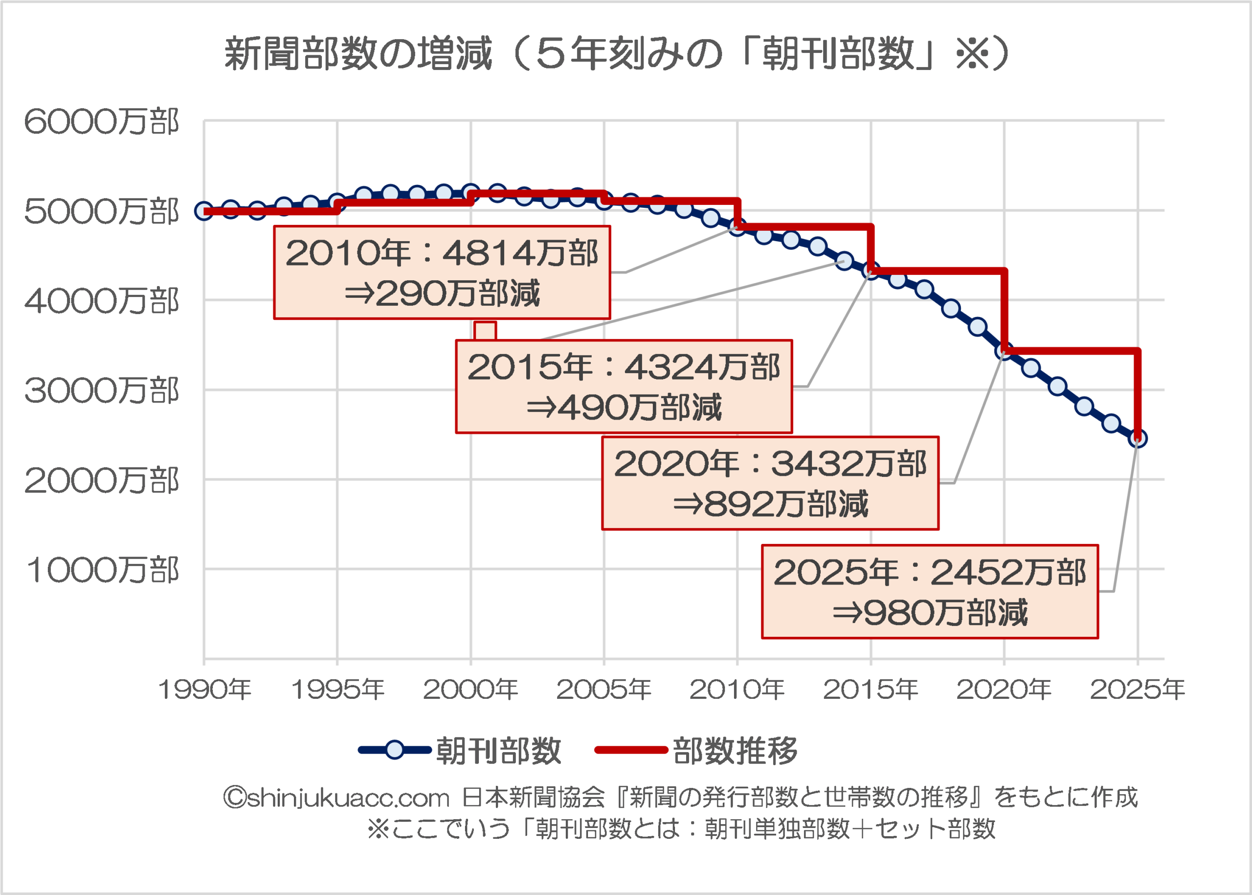 5年刻みにしてみると、やはり2020年から25年にかけての5年間での部数が1410万部減ったのが印象的です。つまり、5年で部数がざっと3分の2になった(=ざっと3分の1の部数が失われた)、という計算です。