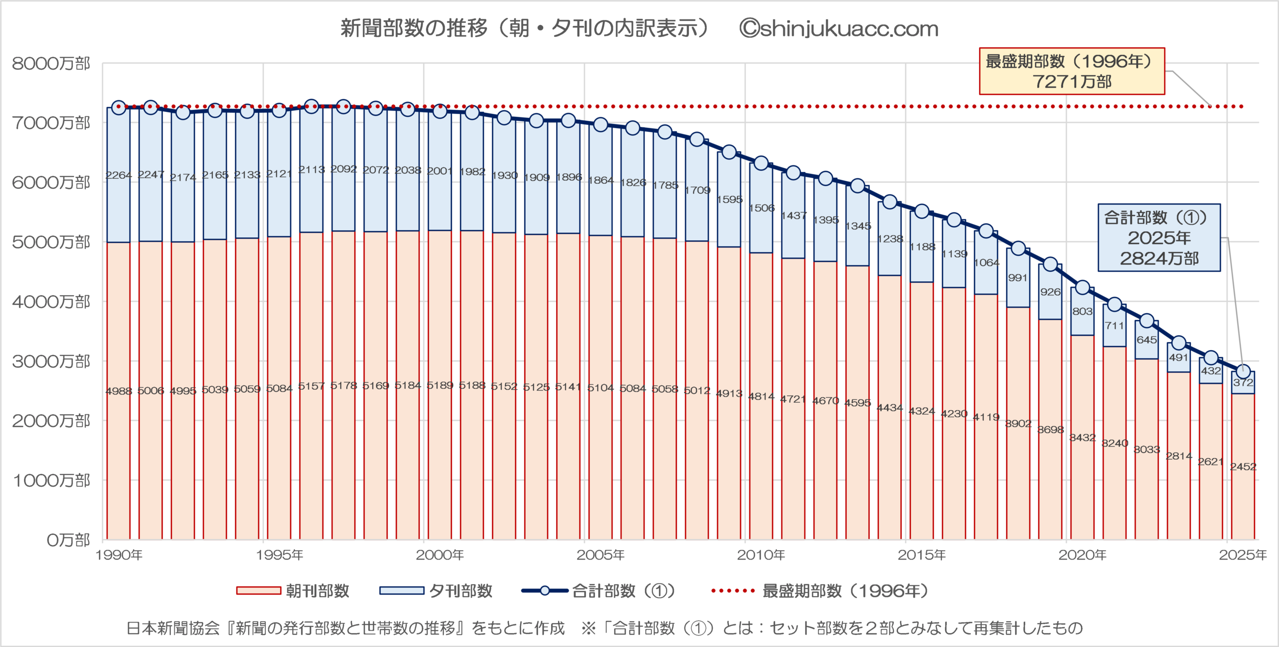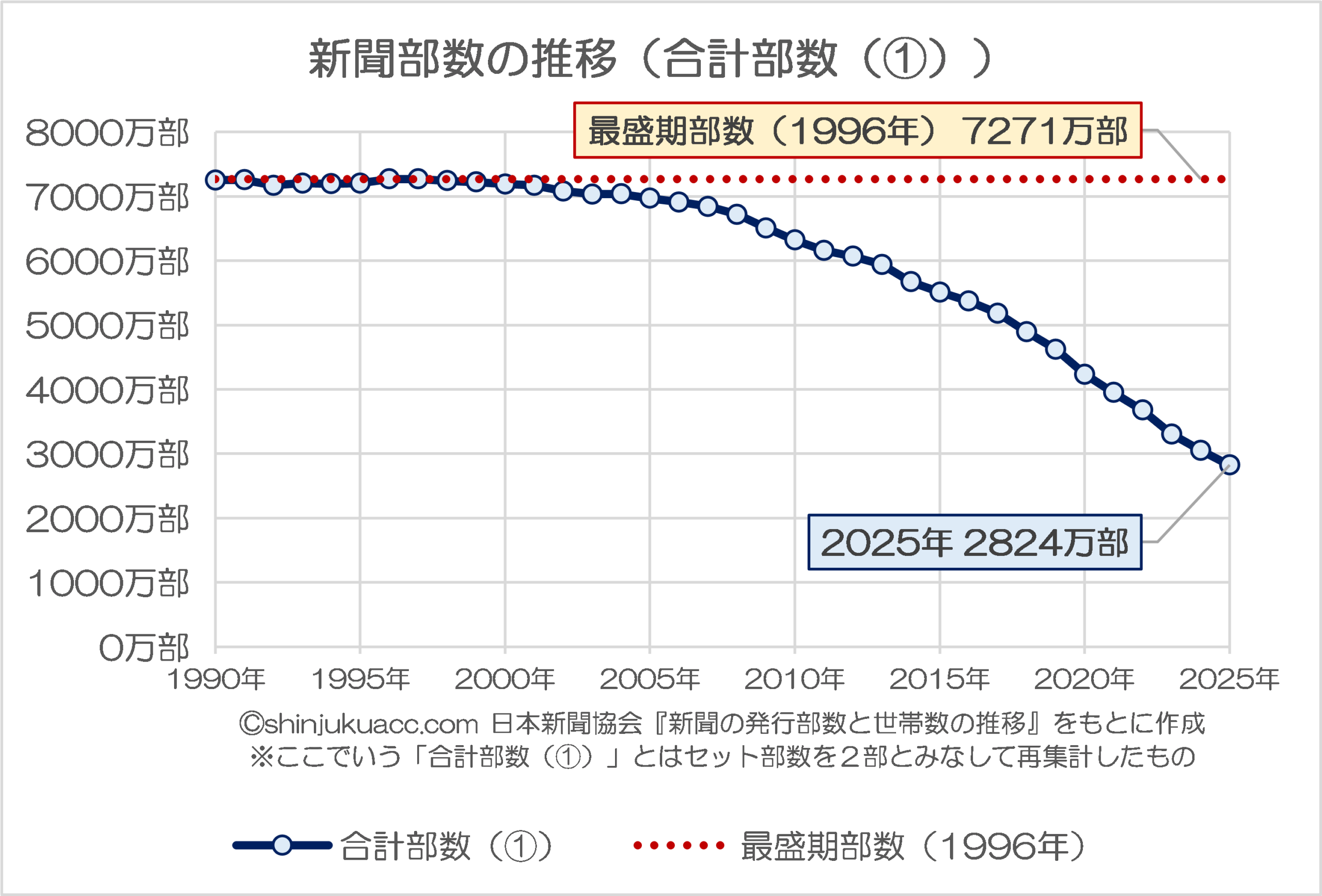 ただ、個人的には、新聞部数を把握するときには「セット部数」を1部とカウントするのではなく、朝刊と夕刊の2部とカウントした方が実態に近いと考えているため、セット紙を朝・夕刊別に数えた場合の部数の合計を、本稿では「合計部数(①)」と呼んだうえで、こちらをメインに考察を進めていきたいと思います。