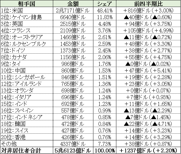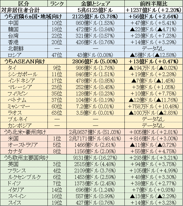 トップの米国が2兆7171億ドルで、これは邦銀の対外与信総額5兆6123億ドルの48.41%であり、しかも対米投融資だけで前四半期比816億ドルも膨らんでいます。