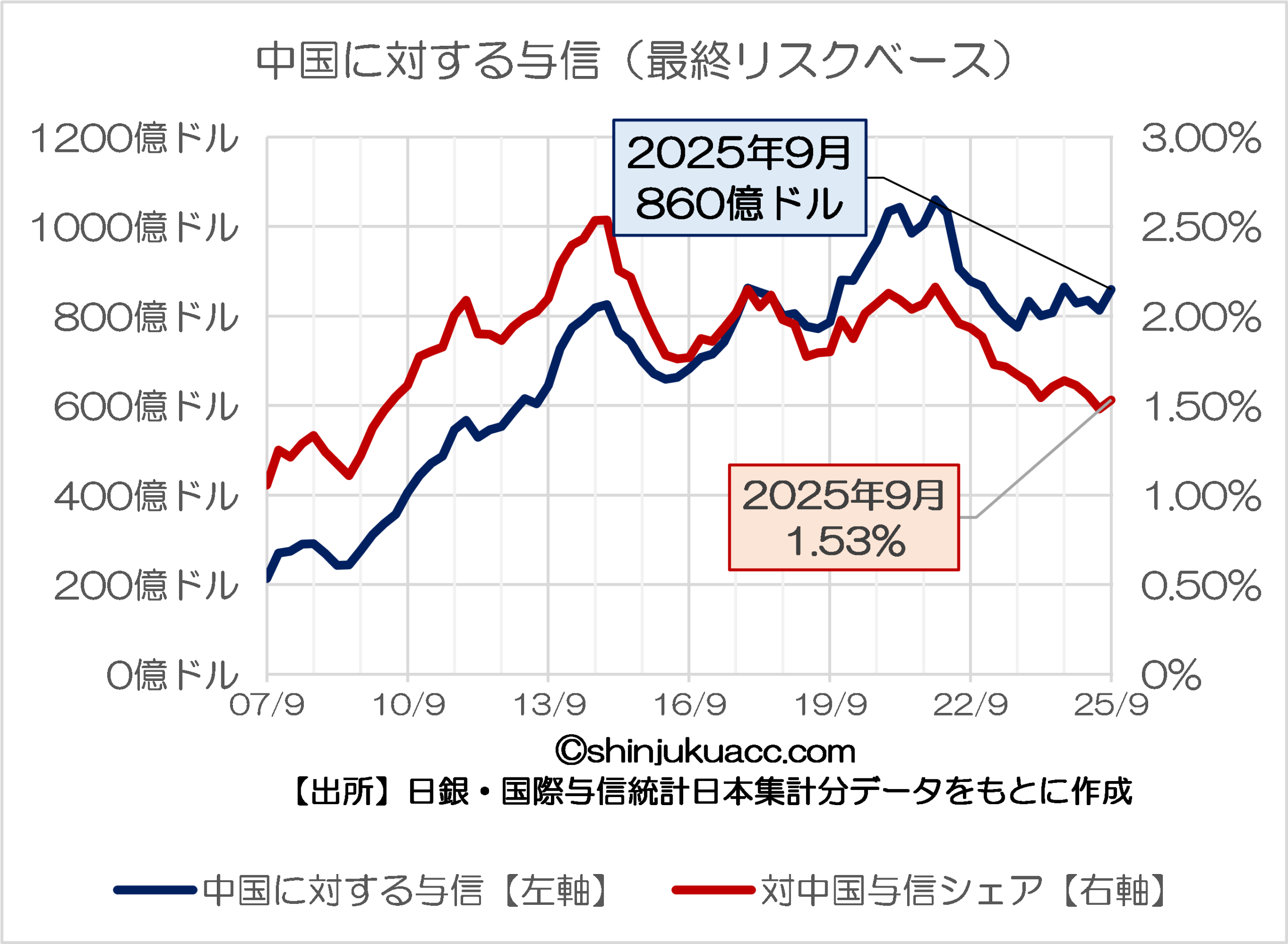 まず、中国に対する与信は、2020年以降、やや伸び、2021年12月ごろには過去最大となっていましたが、その後は減少し、現時点では860億ドル、邦銀の対外与信全体に占める割合も1.53%と、ここ15年で最低水準に落ち込んでいることがわかります。
