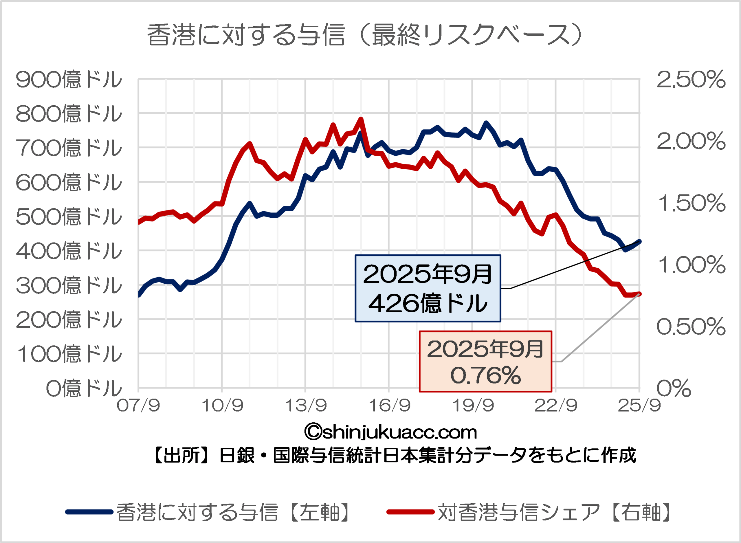 香港向け与信については、とくにこの5~6年の間、金額、シェアともに低下を続けており、2025年9月期だと香港向け与信は426億ドル、邦銀の対外与信全体に占めるシェアは0.76%であり、なんとこれは韓国向けよりも少ないのです。