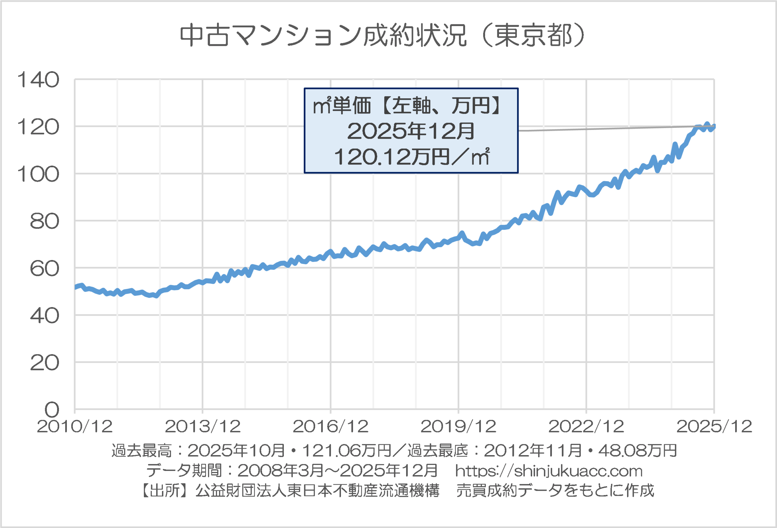 2025年を通じて、東京都内の中古マンション価格は14%上昇したことが判明しました。国土交通省『住生活基本計画(全国計画)』(令和3年3月19日閣議決定)では、「最低居住面積水準」は独居で25平米、2人以上で暮らしている場合は「10平米×世帯人員+10平米」だそうですが、東京都心3区(千代田区、中央区、港区)で子育て用の50~60平米の物件を買おうと思うと「億ション」状態になっている可能性が高い、ということでもあります。