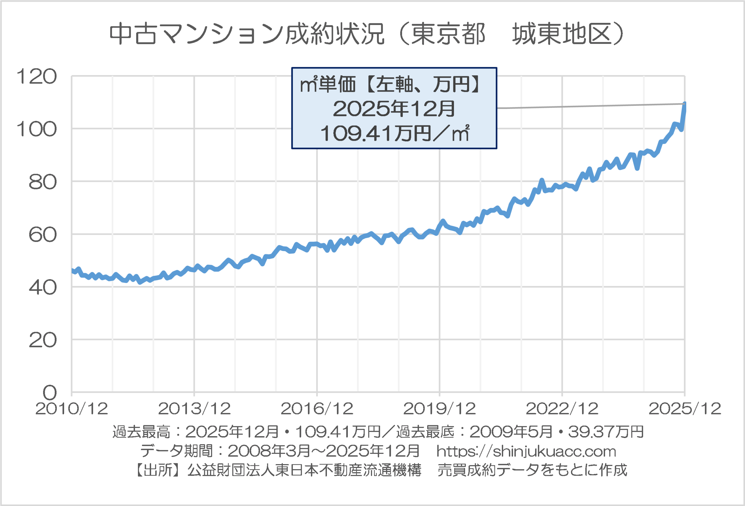城東地区109.41万円(2025年12月)39.37万円(2009年5月)2.78倍