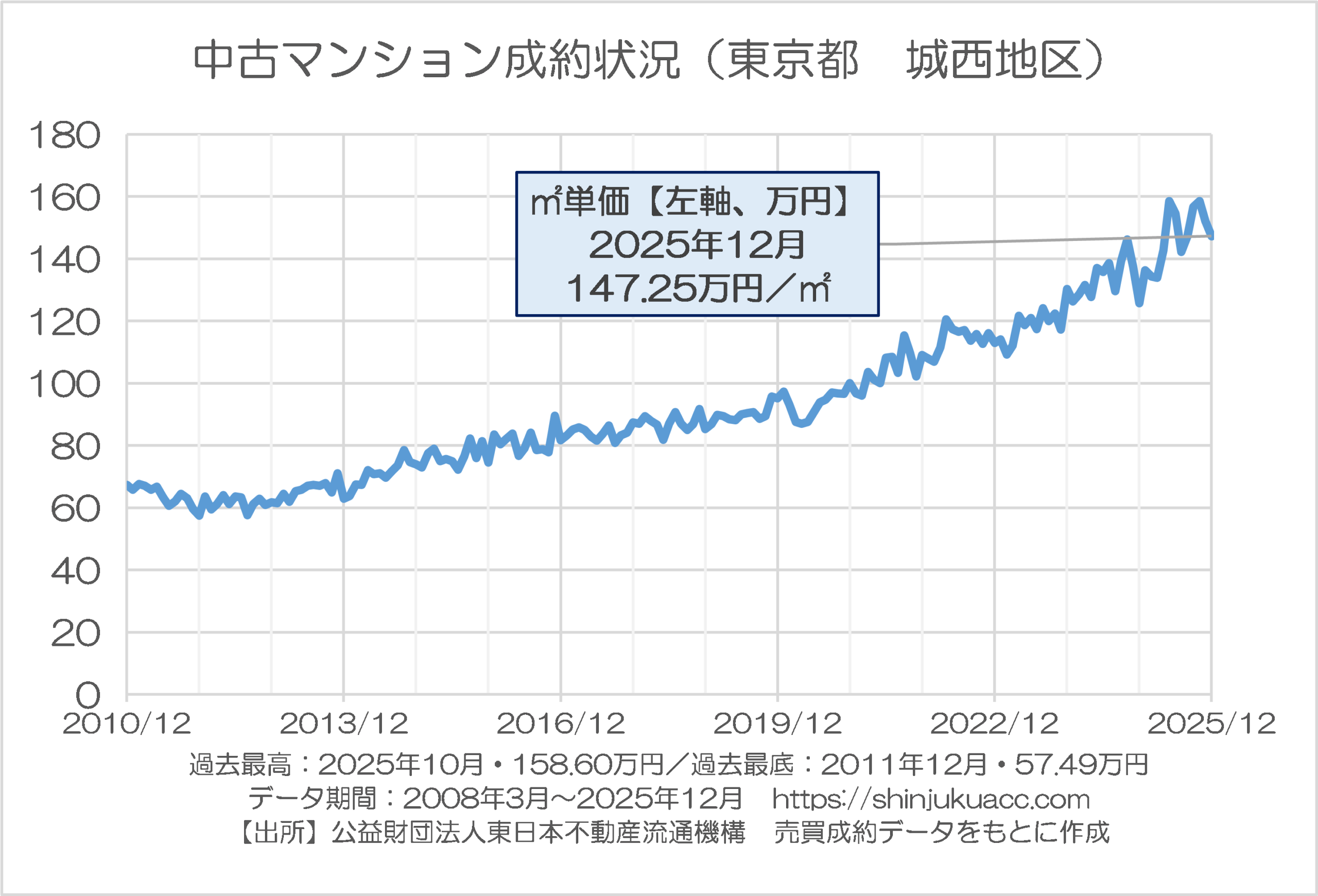城西地区158.60万円(2025年10月)57.49万円(2011年12月)2.76倍
