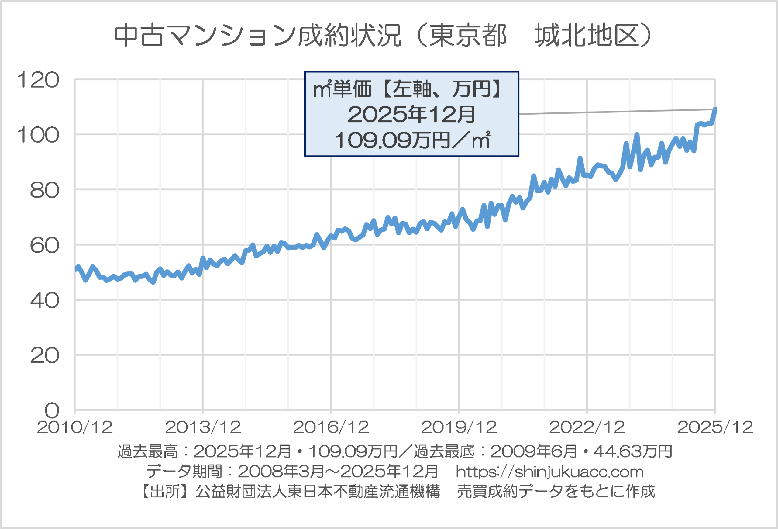 城北地区109.09万円(2025年12月)44.63万円(2009年6月)2.44倍