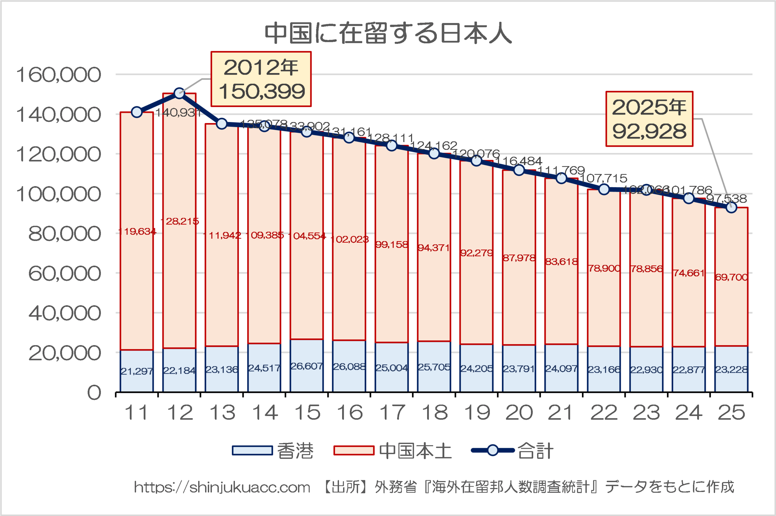たとえば当ウェブサイトでもしばしば指摘している通り、中国に在留する日本人は2012年の約15万人をピークに減り続けており、2024年には10万人の大台を割り込み、直近・2025年10月時点ではこれが92,928人にまで減少しています(図表1)。