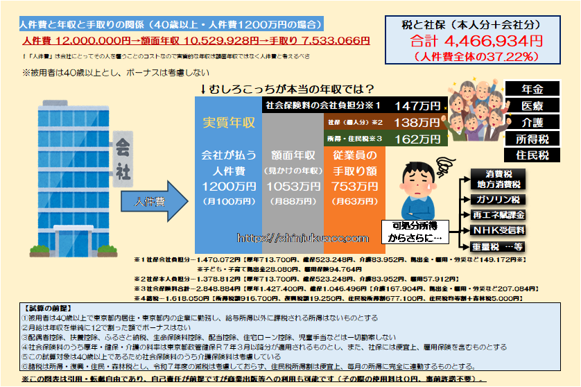 また、額面年収から社会保険料の本人負担分や所得税、復興税、住民税などを控除した残額が本人の手取りですが、この設例だと年額753万円、月額だと63万円です。100万円稼いで手元に6割チョイしか残らないわけですから、なかなかにしんどい制度です。