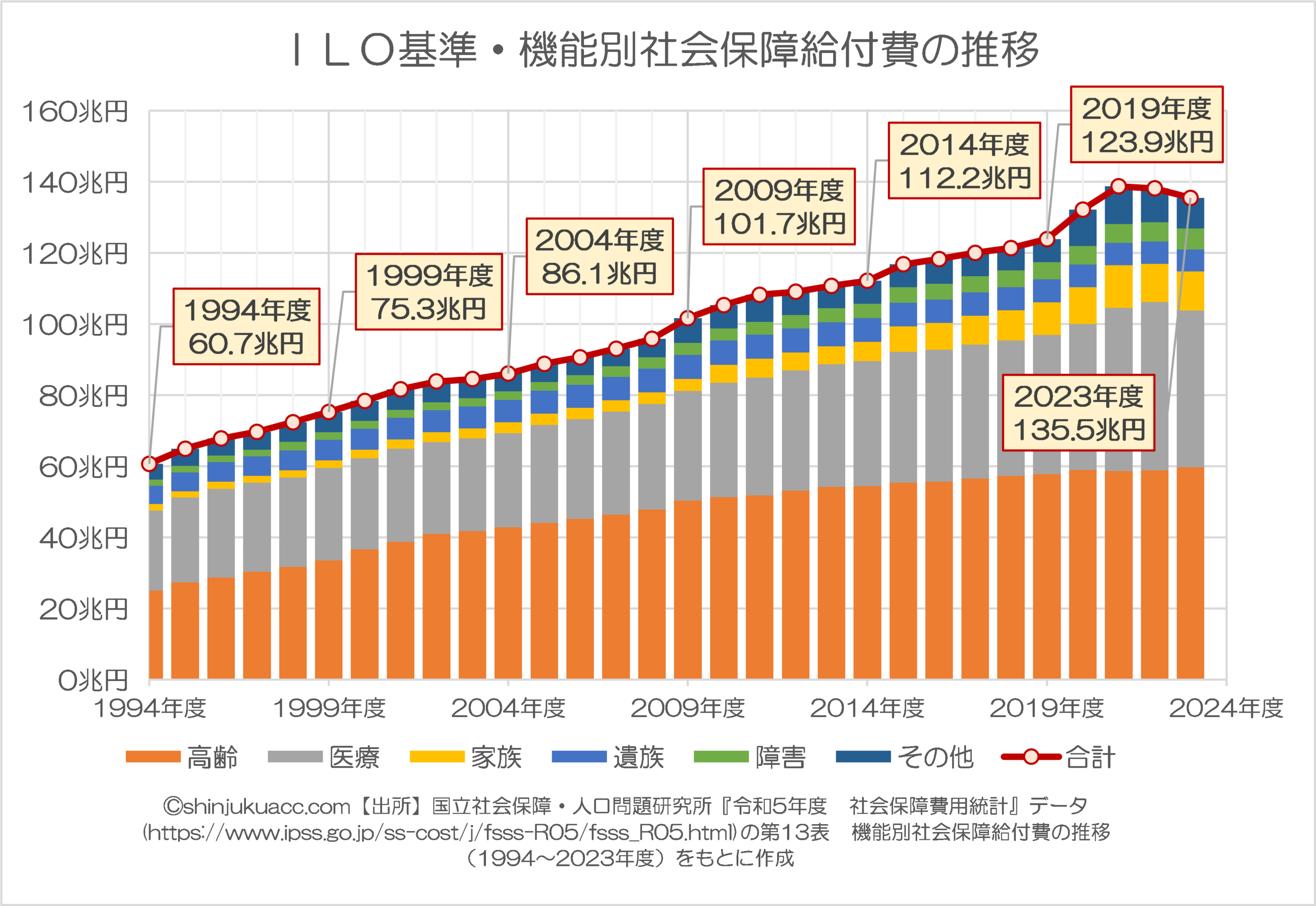 一方、同研究所はこの社会保障給付費について、「ILO基準に基づく機能別分類」についても公表しており(※ただし1994年以降分のみ)、これに基づいてその推移を展開すると、図表4のとおりです。